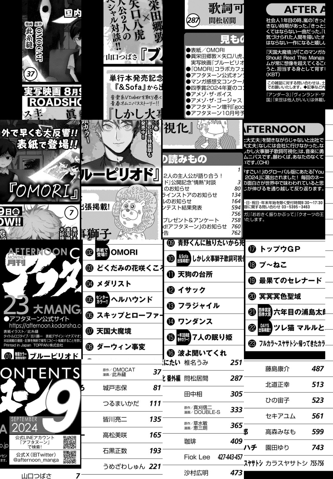 アフタヌーン9月号、表紙は前号新連載開始で大評判の『OMORI』(原作:OMOCAT/漫画:此糸縫)! 巻頭カラーは実写映画『ブルーピリオド』公開記念“情熱”対談!眞栄田郷敦×矢口八虎、2人の主人公が語り合う! 巻中カラー1つめは8月22日単行本5巻発売の『ヘルハウンド』(皆川亮二)! 巻中カラー2つめは7月23日単行本5巻発売の『7人の眠り姫』(Fiok Lee)! 『青野くんに触りたいから死にたい』12巻『フラジャイル』28巻も7月23日発売! 夏本番!