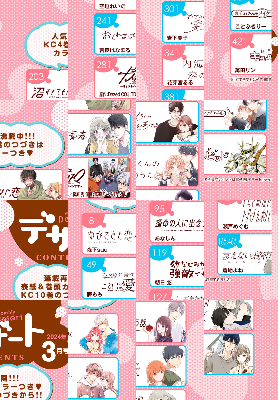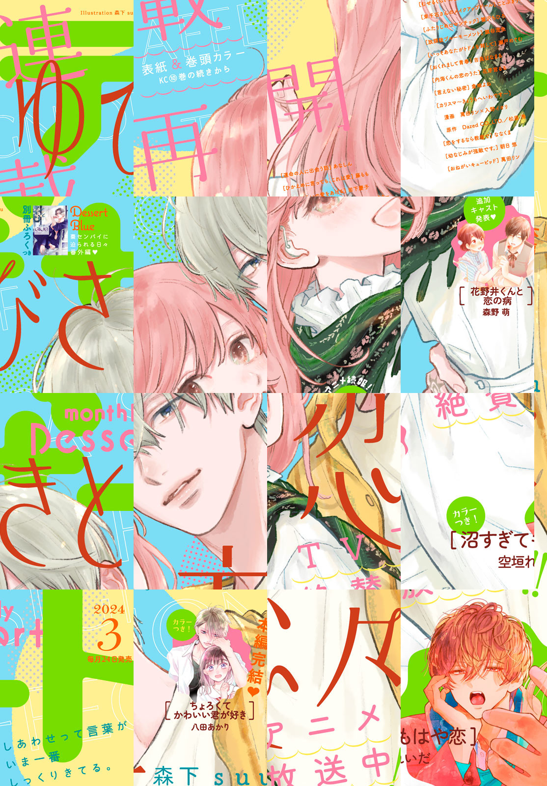 表紙&巻頭カラーで、アニメが絶好調放送中の『ゆびさきと恋々』が登場! 豪華声優陣たちのボイス企画も★ さらに最新刊が絶賛発売中の『沼すぎてもはや恋』は4巻と連動で缶バッジ2個セットがもらえる初の応募者全員プレゼントも実施です! 連続ドラマが放映中の『リビングの松永さん』では、中島健人さん&向井康二さんの両面ピンナップ&キャストインタビューも(紙版3月号のみ)! 映画化が決定した『恋わずらいのエリー』最新情報も(※こちらも紙版3月号のみ)♪ 大人気『ちょろくてかわいい君が好き』は、超ハッピーな本編最終回をお届けします。別冊ふろくは「Blue」。表紙は『棗センパイに迫られる日々』のかみのるりさん登場! 『ひかめに言っても、これは愛』『むせるくらいの愛をあげる』が読めるのもデザートだけ! デザート3月号をよろしくお願いします! ※『沼すぎてもはや恋』4巻連動応募者全員プレゼント応募券は電子版には付属いたしません。電子版では、紙の雑誌と内容が一部異なる場合や、掲載されないページがあります。ご了承ください。