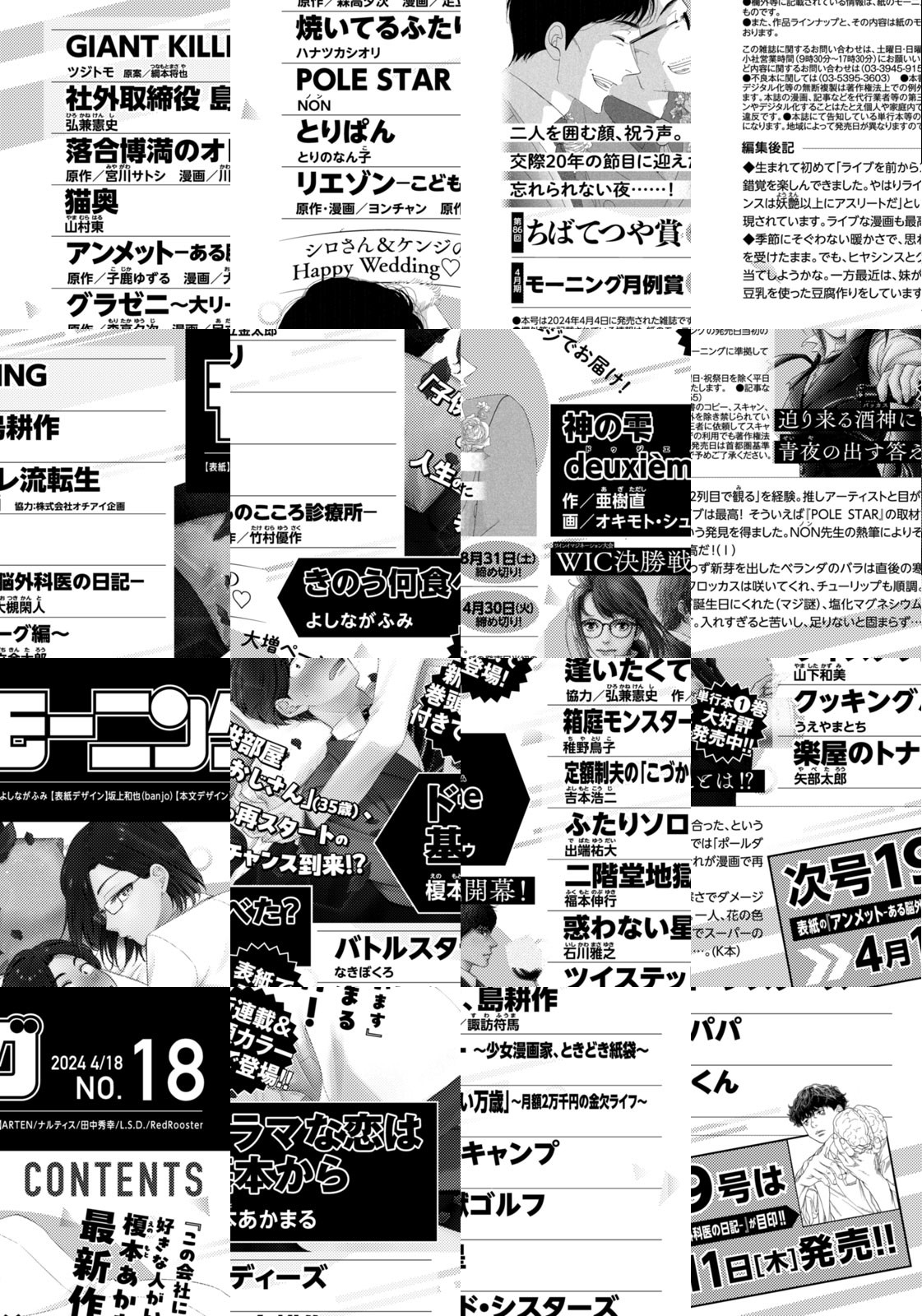 ◎『ドラマな恋は基本から』は新連載&巻頭カラー付きで登場!! 『この会社に好きな人がいます』榎本あかまる最新作! 「子供部屋おじさん」(35歳)、人生の再スタートのチャンス到来!? ◎『きのう何食べた?』は表紙で登場! 大増ページでお届け! シロさん&ケンジのHappy Wedding♪♪ 二人を囲む顔、祝う声。交際20年の節目に迎えた忘れられない夜……! ◎『神の雫 deuxieme』。単行本1巻大好評発売中!! WIC決勝戦開幕! 迫り来る酒神に青夜の出す答えとは!? ※作品ラインナップは、紙の「モーニング」に準拠しておりますが、一部、異なる場合があります。