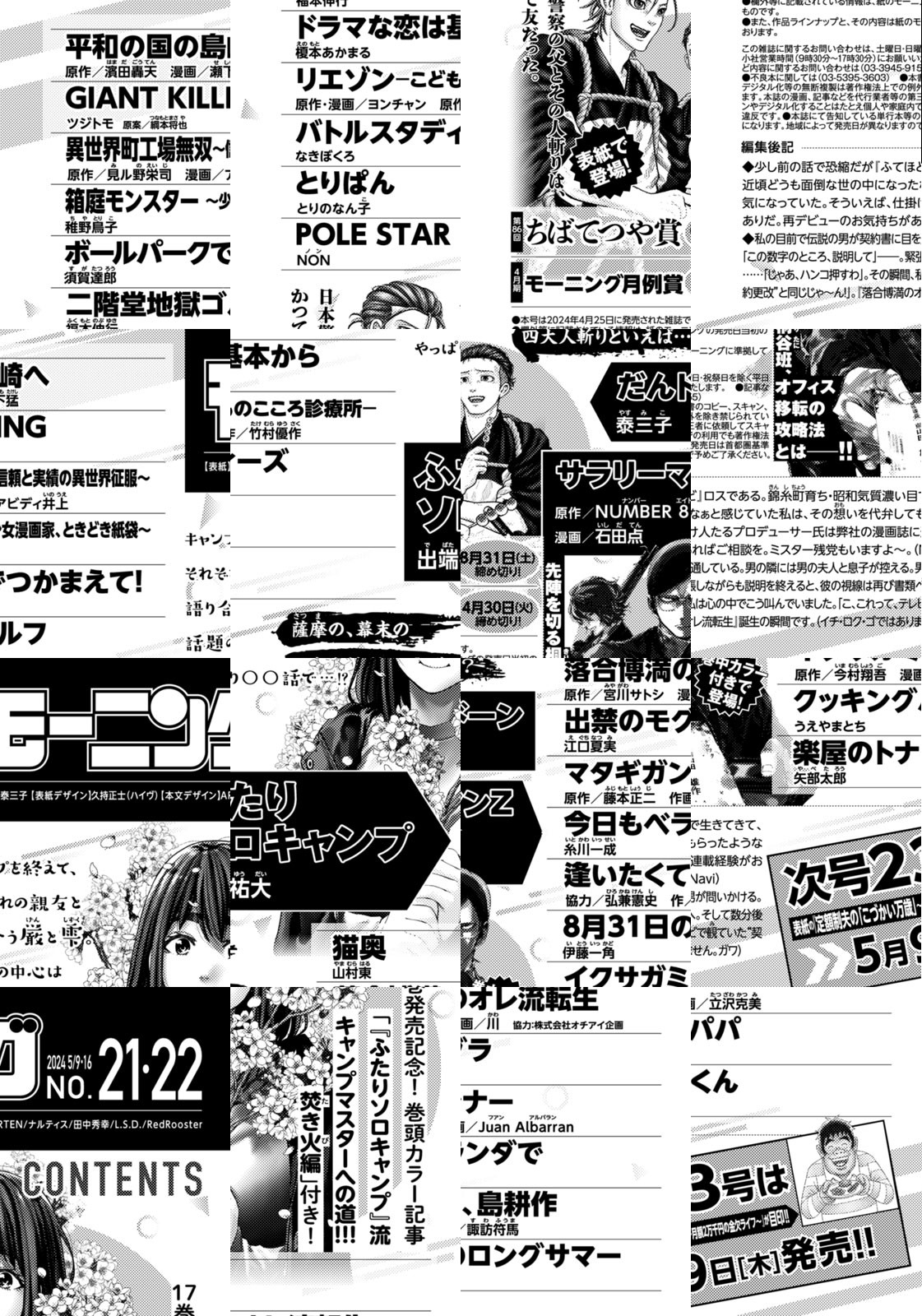 ◎『ふたりソロキャンプ』は17巻発売記念! 巻頭カラー記事「『ふたりソロキャンプ』流 キャンプマスターへの道!!! 焚き火編」付き! キャンプを終えて、それぞれの親友と語り合う厳と雫。話題の中心はやっぱり○○話で…!? 『だんドーン』は表紙で登場! 薩摩の、幕末の四大人斬りといえば…? 日本警察の父とその人斬りは、かつて友だった。 ◎『サラリーマンZ』は巻中カラーで登場! 先陣を切る桐谷班、オフィス移転の攻略法とは――!! ※作品ラインナップは、紙の「モーニング」に準拠しておりますが、一部、異なる場合があります。