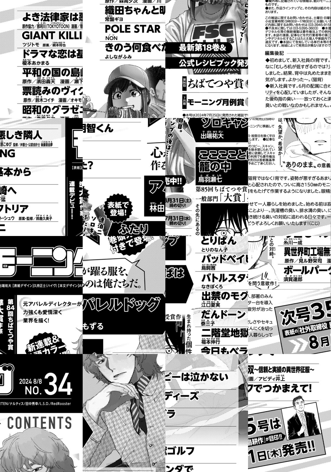 ◎『アパレルドッグ』は新連載&巻頭カラー付きで登場! 第84回ちばてつや賞準大賞作家、連載デビュー! 元アパレルディレクターが、力強くも愛情深く業界を描く! 心が躍る服を、作るのは俺たちだ。 ◎『ふたりソロキャンプ』は表紙で登場! 連泊二日目。ソロキャンプの後は…ふたりソロキャンプで! 最新第18巻&公式レシピブック発売中!! ◎『こここことばは籠の中』は第85回ちばてつや賞一般部門「大賞」受賞作。生まれ持った個性との対峙。その先にあるのは、失望か、希望か――。“ありのまま”の意義を問う意欲作! ※作品ラインナップは、紙の「モーニング」に準拠しておりますが、一部、異なる場合があります。