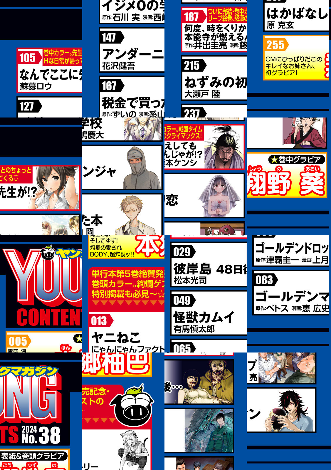 〈巻頭カラー〉にゃんにゃんファクトリー『ヤニねこ』煙たいねこが、また巻頭に来ましたよ、っと。ヤニねこ、カラーで大暴れ!豪華4pカラー漫画で登場&7名の絢爛ゲストも特別掲載で満足度◎。最新単行本第5巻、こないだ出ました。累計25万部しれっと突破。〈巻中カラー〉原作:井出圭亮、漫画:藤本ケンシ『何度、時をくりかえしても本能寺が燃えるんじゃが!?』『なんじゃが』、完結ーー(表罫)!最後の「時かけ」は現代に!?戦国タイムリープ絵巻、怒濤のクライマックス!〈巻末カラー〉 蘇募ロウ『なんでここに先生が!?』先生とのちょっとHな日常が帰ってくる☆ 原作:四葉夕卜 漫画:小川亮『パリピ孔明』巻末カラー!230万部突破!最新単行本第17巻 8月6日(火)発売!タイアップを獲得したEIKOを待ち受けるのはクセすご天才監督!!〈表紙&巻頭グラビア〉「本郷柚巴」青空、海、そしてゆず!灼熱の愛されBODY、超炸裂ッ!!〈巻中グラビア〉「翔野 葵」多くのCMに出演するキレイなお姉さんが初グラビアをお披露目!〈巻末グラビア〉「塚越愛実、新 唯、西 綾乃、ひなた まる、豊田ルナ、東条 澪、田丸りさ、HIKARU、菅原早記、石垣果蓮」まだまだ営業中!ヤンマガ仕様の海の家 ヤンマガGRAND BEER TERRACE in由比ヶ浜 毎週土曜に出勤中!GRAND BEER GALSが水着姿で全員登場!