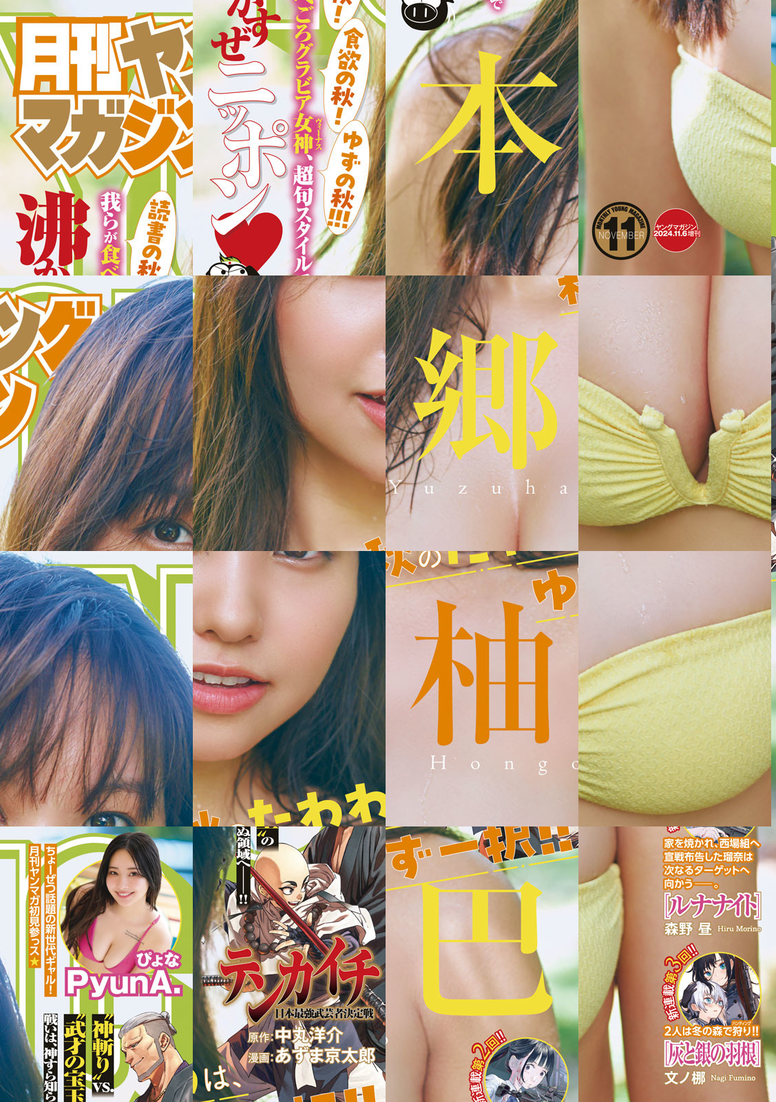 秋か冬かもわかんねーけど・・ここがアツけりゃどうでもいいよなぁ!?巻頭グラビアは本郷柚巴ちゃん!!来たぜ俺らのグラビア女神!ひと味もふた味も違う“オトナゆず”、ご賞味くださいましッ!!!巻末グラビアはPyunA.ちゃん!イマ大注目の新世代GAL、ついに月刊ヤンマガ初登場!!漫画はテンカイチ!!第七仕合、超速激化!!“神斬り”林崎甚助vs.“武才の宝玉”宝蔵院胤舜の戦いは、神すら知らぬ領域へーーー!!