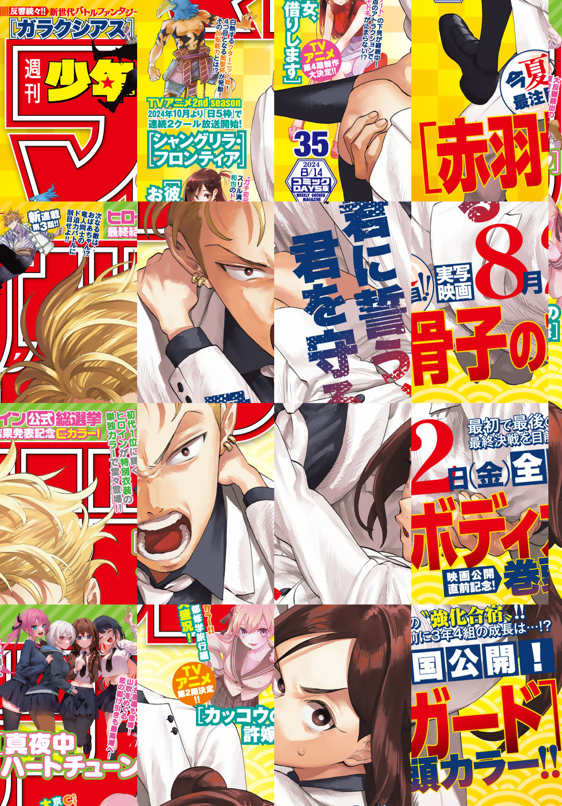 ※『巻頭グラビア』および一部の記事は収録されていません。紙版と一部内容が異なります。ご了承ください。 【表紙&巻頭カラー】[赤羽骨子のボディガード]今夏最注目!!実写映画8月2日(金)全国公開! 【Cカラー】[カッコウの許嫁]京都修学旅行編大盛況!最新第23巻『あいコレ』付き特装版も発売中!! 【Cカラー】[真夜中ハートチューン]ヒロイン公式総選挙!最終結果発表初代1位に輝くヒロインが特別衣装で登場!! 『FT』『ダイヤのA』の再掲載が読めるのは電子版だけ!