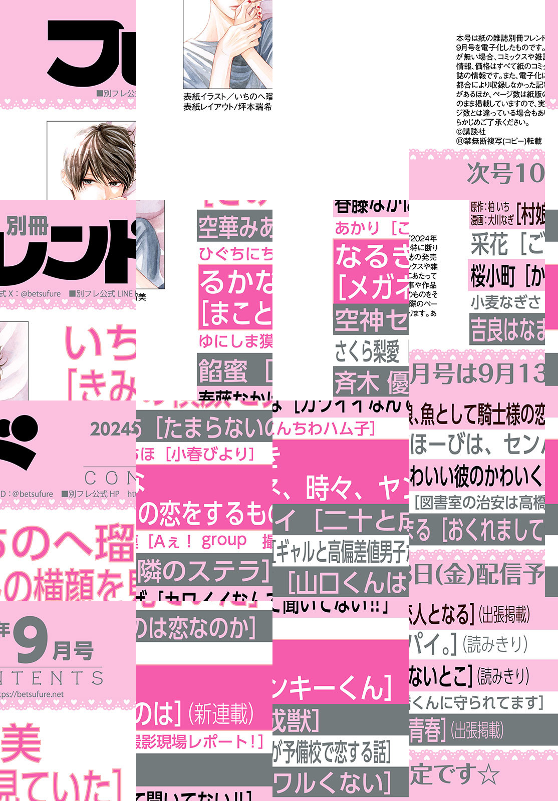 別フレ9月号(2024年)は、最新KC4巻発売中&講談社漫画賞受賞で超話題の『きみの横顔を見ていた』(いちのへ瑠美)が表紙&巻頭カラー★ 今回の主役は大人気・松平先生! スペシャルキャンペーンも開催中なのでお見逃しなく♪ そして紙版では大注目のボーイズグループ・Aぇ! groupが2号連続で登場!! 前編の今号はB4サイズの両面ピンナップとシックなスタイルが秋っぽ&大人っぽい、撮りおろしグラビアインタビューです。重版が止まらない『メガネ、時々、ヤンキーくん』(なるき)はカラー扉付き★ 7巻の続きが読めちゃいます。るかな先生待望の新連載『まことの恋をするものは』もスタートし、「きゅん」が大充実のラインナップです♪ ※電子版では紙の雑誌と内容が一部異なる場合や、掲載されないページがあります。 ※内容の一部は、2024年11月13日までの閲覧期限となります。
