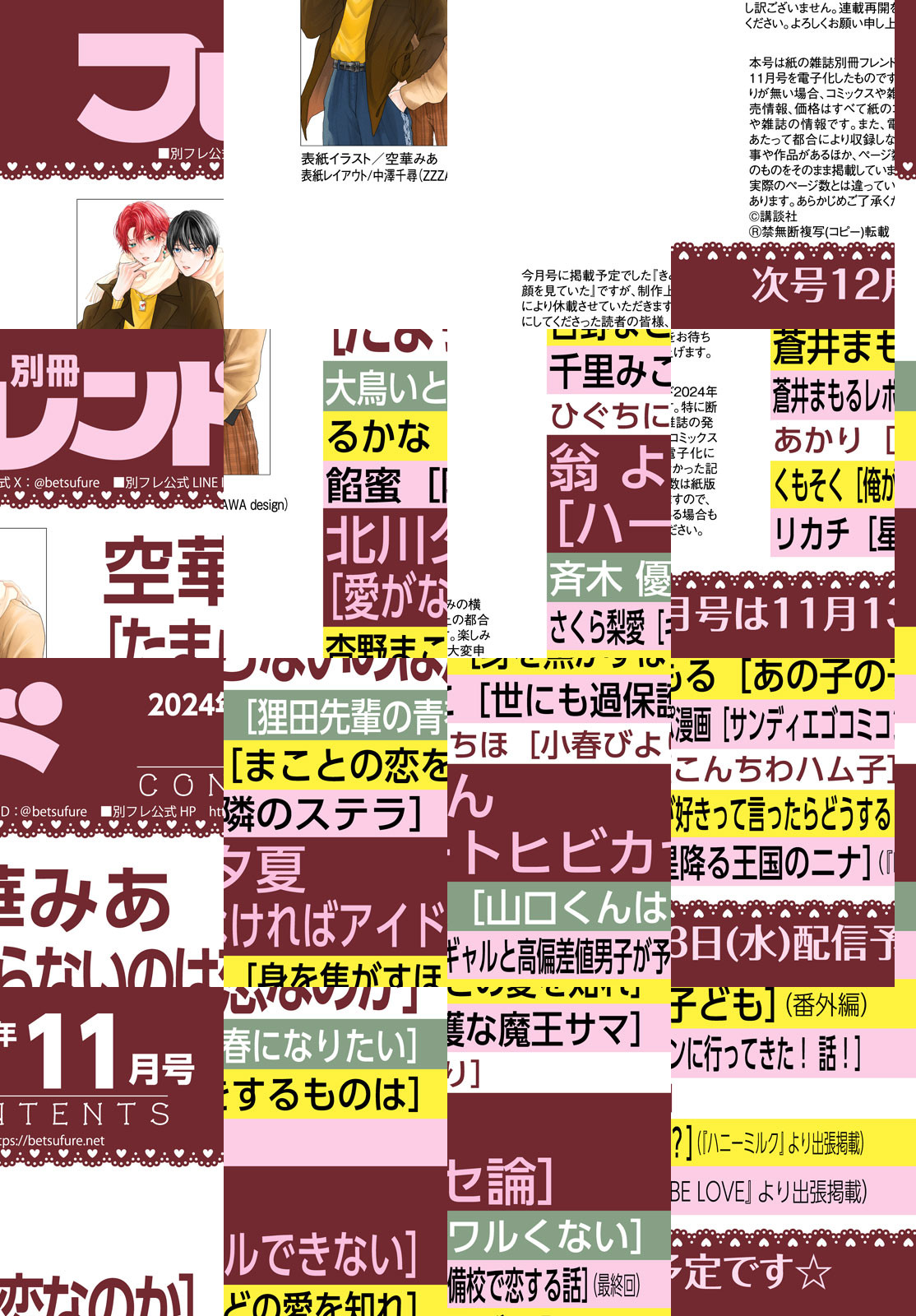 別フレ11月号(2024年)は、爆速で累計15万部目前まで重版を重ねている『たまらないのは恋なのか』(空華みあ)が初表紙&巻頭カラー★ 紙版には、空華先生の描きおろしイラストをたっぷり使ったイラストカードがふろくに♪ 神アイドル×陰キャオタク女子の秘密のロマンスが話題沸騰の『愛がなければアイドルできない』(北川夕夏)がついに1巻発売! カラー扉つきで読めちゃいます! ほかにも1巻発売中の『ハートヒビカセ論』(翁 よん)や昴&千明&高橋&真珠の四角関係にますます目が離せない『隣のステラ』(餡蜜)など、秋の夜長にキュンが止まらない大充実ラインナップでお届けです★ ※電子版では紙の雑誌と内容が一部異なる場合や、掲載されないページがあります。