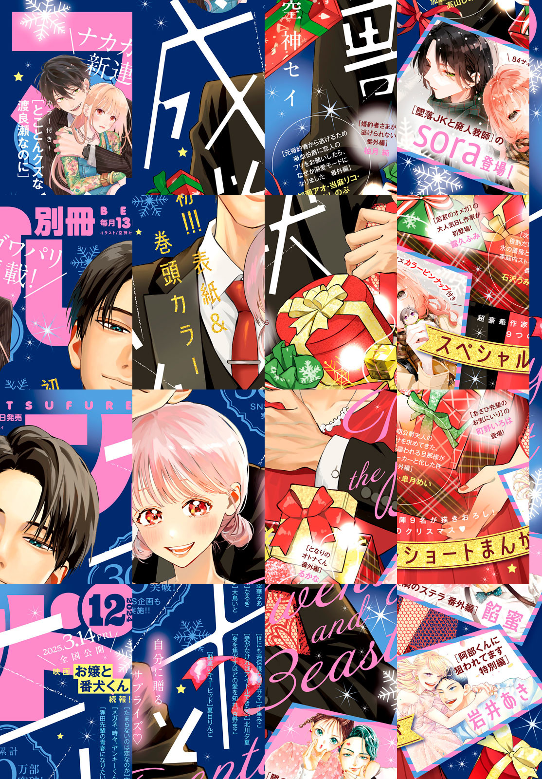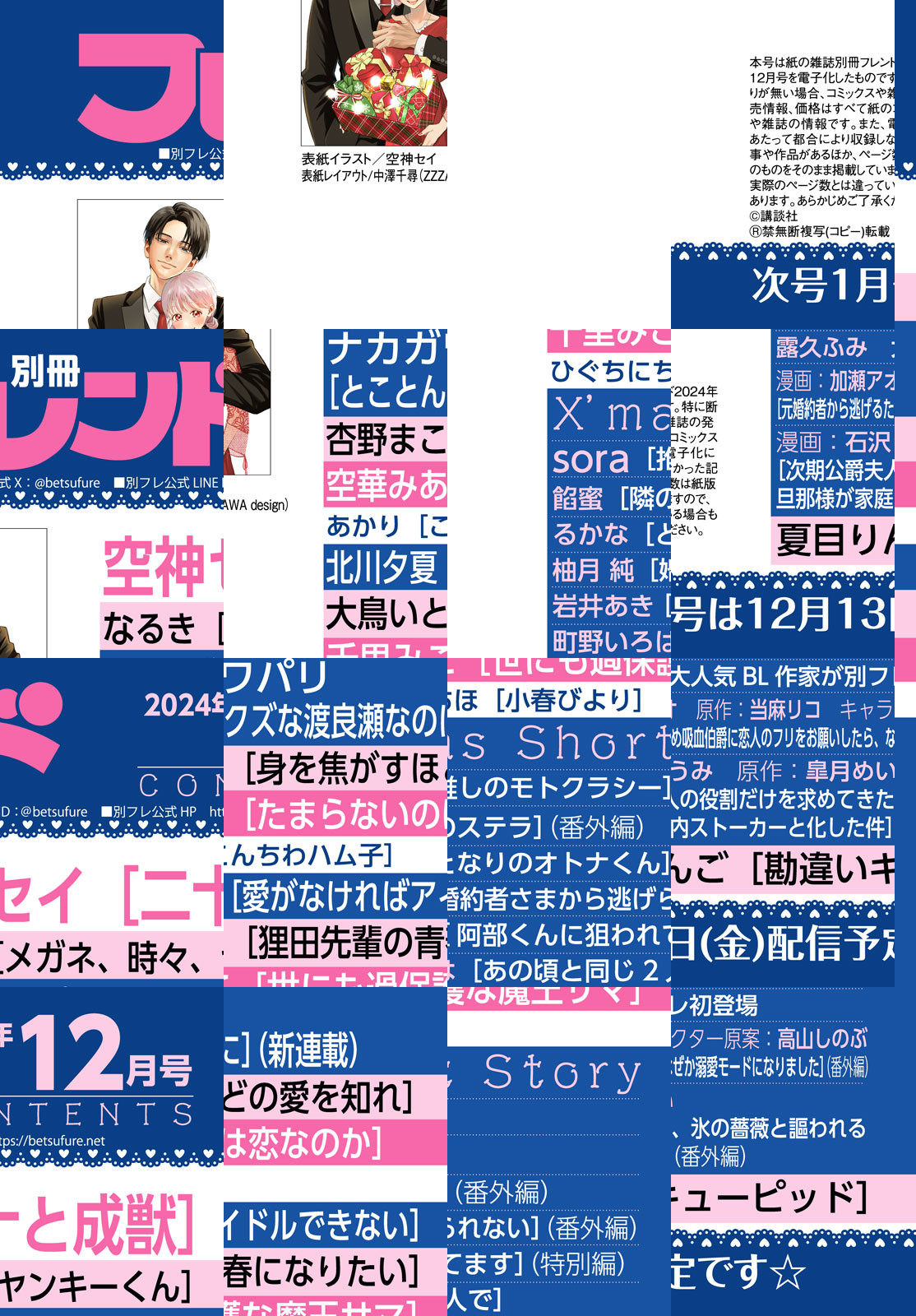 別フレ12月号(2024年)は、いちばんMERRYでメロいクリスマス号★ 早くも累計30万部突破&全巻重版の大快進撃を続ける『二十と成獣』(空神セイ)が初表紙&巻頭カラーを飾ります! 大人の色気にメロメロです♪ 超豪華9名によるクリスマスショートストーリーでは、『隣のステラ』(餡蜜)の番外編や大人気作家・sora先生の新作、別フレ初登場の大人気作家・露久ふみ先生のお話などが読めちゃいます♪ 次に来るメロい男の大本命!! 新連載『とことんクズな渡良瀬なのに』(ナカガワパリ)も見逃せない~★ ※電子版では紙の雑誌と内容が一部異なる場合や、掲載されないページがあります。 ※内容の一部は、2025年2月13日までの閲覧期限となります。