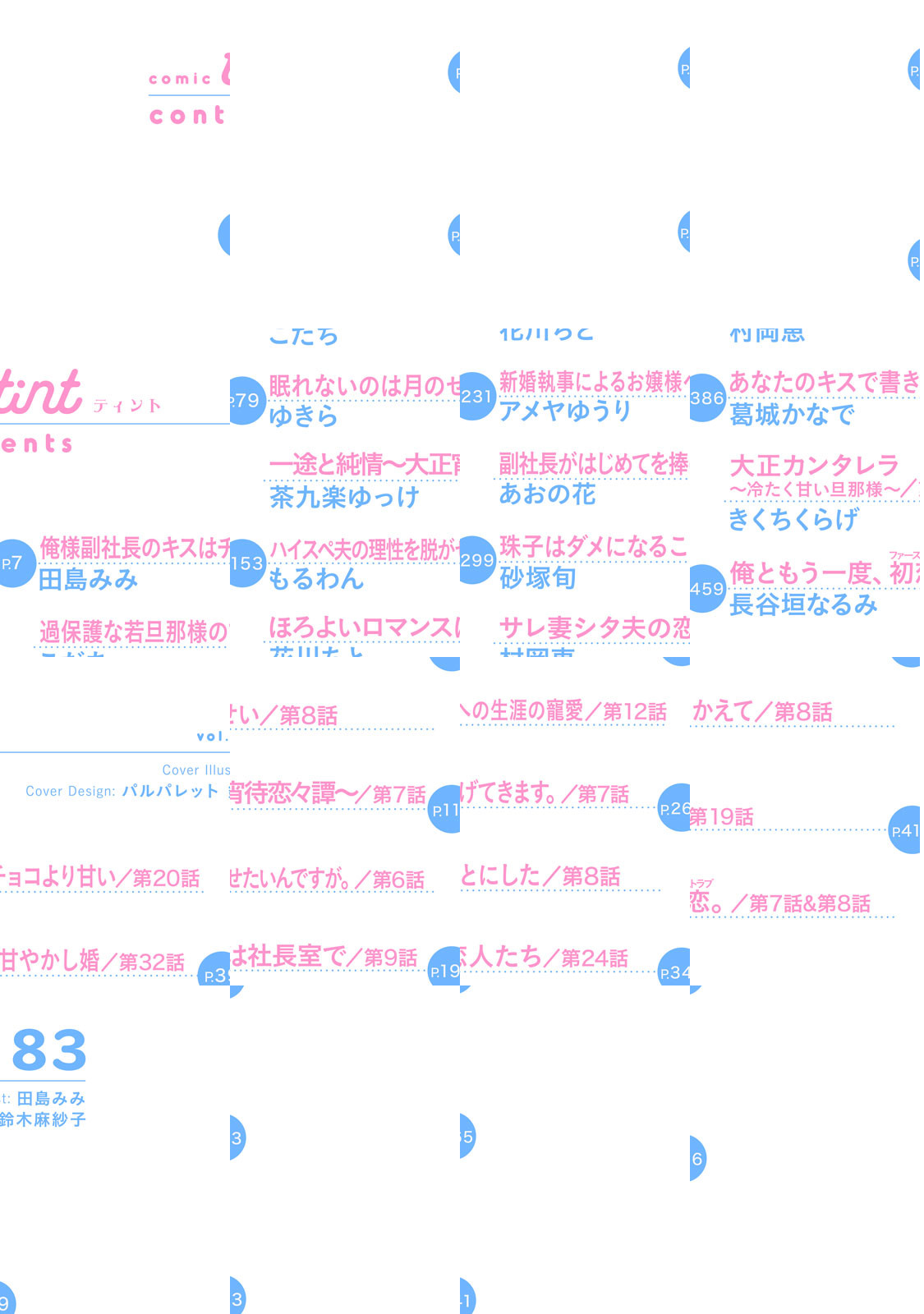本命LOVE、咲きました。「俺様副社長のキスはチョコより甘い」が目印☆ オトナ女子に贈る恋愛コミック誌「comic tint」vol.83、配信スタート! <本命LOVE、咲きました★LOVEラインナップ13作品♪> ☆【表紙&巻頭で登場!】 *私がハイスぺ副社長の婚約者に!? 【完結!】「俺様副社長のキスはチョコより甘い」第20話(田島みみ) * 「過保護な若旦那様の甘やかし婚」第32話(こだち) *「眠れないのは月のせい」第8話(ゆきら) * 「一途と純情~大正宵待恋々譚~」第7話(茶九楽ゆっけ) *「ハイスペ夫の理性を脱がせたいんですが。」第6話(もるわん) *「ほろよいロマンスは社長室で」第9話(花川ちと) *【完結!】「新婚執事によるお嬢様への生涯の寵愛」第12話(アメヤゆうり) *「副社長がはじめてを捧げてきます。」第7話(あおの花) *【完結!】「珠子はダメになることにした」第8話(砂塚旬) *「サレ妻シタ夫の恋人たち」第24話(村岡恵) *【完結!】「あなたのキスで書きかえて」第8話(葛城かなで) *「大正カンタレラ~冷たく甘い旦那様~」第19話(きくちくらげ) *「俺ともう一度、初恋。」第7話&第8話(長谷垣なるみ) ※内容の一部は、2025年6月5日までの閲覧期限となります。 /////////////////////////////////// オトナ女子に胸キュンをお届けする 「comic tint」は毎月第1金曜配信です☆ ///////////////////////////////////