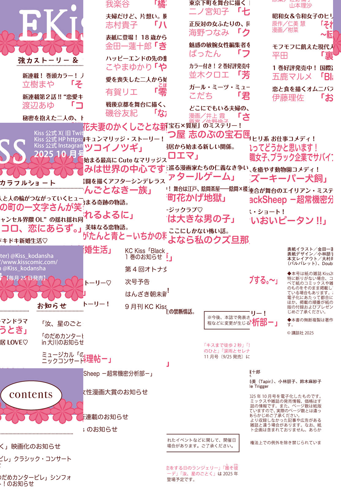 話題沸騰の『きみは世界の中心です』(金田一蓮十郎)が表紙で登場!! 新婚生活をスタートさせたののこと世一。ドキドキのいろんな“初めて”から目が離せない! Kiss初登場となる大注目作家、立樹まやの新連載『その町の一文字さんが笑うとき』が巻頭カラーでスタート!! 人と人とが繋がっていくヒューマンドラマが今、開幕します! コミックス2巻好評発売中の『芳町花かげ地獄』(並木クロエ)は、カラー付きで登場! 『君は大きな男の子』(こだち)の待望の続編もお見逃しなく♪ 強力連載陣『やんごなき一族』(こやまゆかり)、『七つ屋 志のぶの宝石匣』(二ノ宮知子)、『ながたんと青と-いちかの料理帖-』(磯谷友紀)、『クロエマ』(海野つなみ)、『零れるよるに』(有賀リエ)、『ハツコイノツギ』(志村貴子)など、人気作も一挙掲載です。 話題沸騰中のKiss10月号をお楽しみに♪ 【*「Kiss」の電子版「EKiss」には付録、プレゼントページは付きません。ご了承ください】