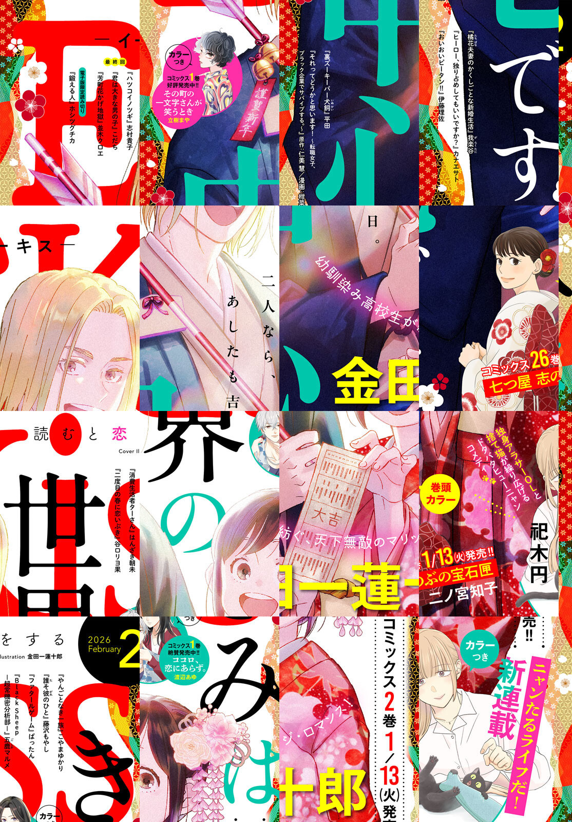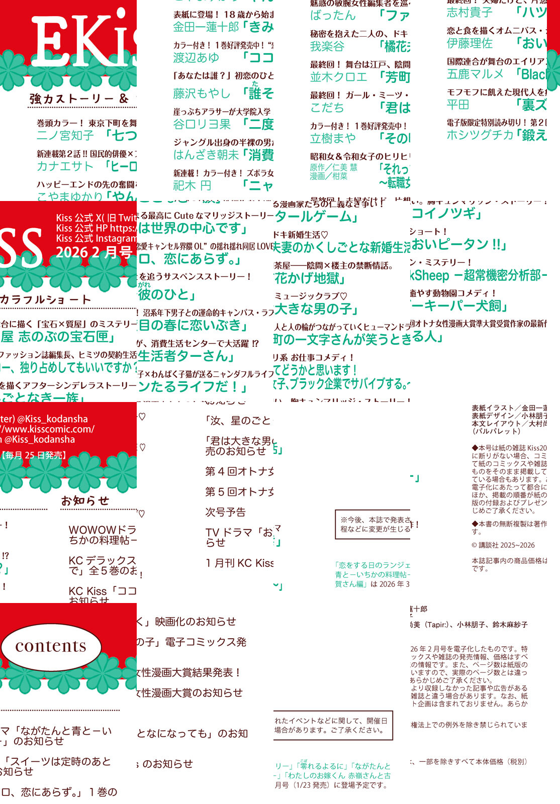 大人気作『きみは世界の中心です』(金田一蓮十郎)のハッピーな表紙が、Kissの新年を彩ります!! 幼馴染高校生たちの新感覚マリッジストーリーに、ときめきが止まらない♪ Kiss初登場の祀木円による新連載『ニャンたるライフだ!』にも要注目! 独身アラサー×捨て猫のドタバタキャットストーリーが今開幕!! 話題作『ハツコイノツギ』(志村貴子)、『芳町花かげ地獄』(並木クロエ)、『君は大きな男の子』(こだち)が最終回ラッシュ! それぞれの想いの行方をお見逃しなく!! また電子版限定で、第2回オトナ女性漫画大賞準大賞受賞作家の最新作『鍛える人』も掲載♪ 強力連載陣、『やんごなき一族』(こやまゆかり)、『七つ屋 志のぶの宝石匣』(二ノ宮知子)、『ファタールゲーム』(ばったん)、『その町の一文字さんが笑うとき』(立樹まや)、『ココロ、恋にあらず。』(渡辺あゆ)など、人気作も一挙掲載です。 年末年始を彩るKiss2月号をお楽しみに♪ 【*「Kiss」の電子版「EKiss」には付録、プレゼントページは付きません。ご了承ください】 ※内容の一部は、2026年3月24日までの閲覧期限となります。