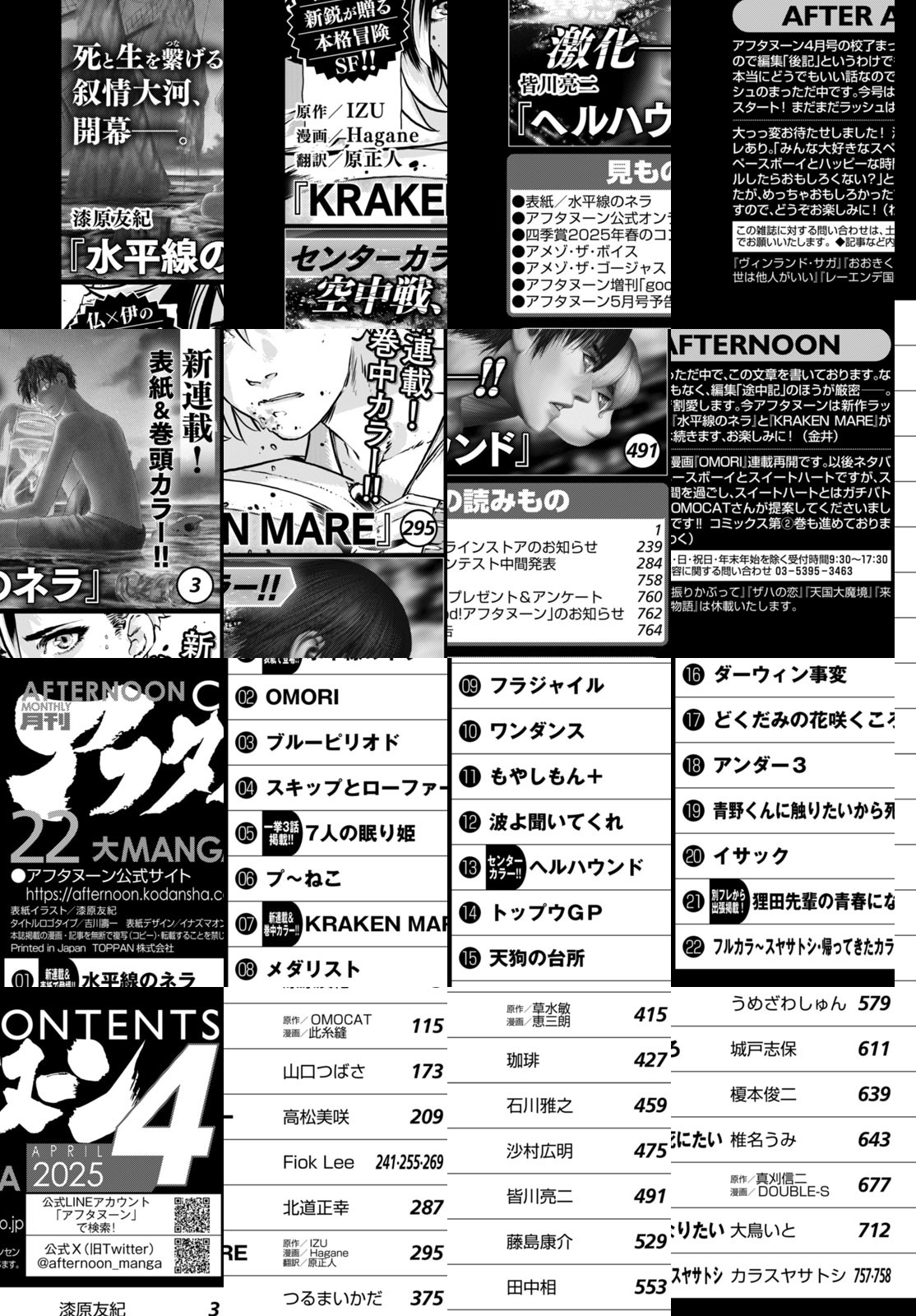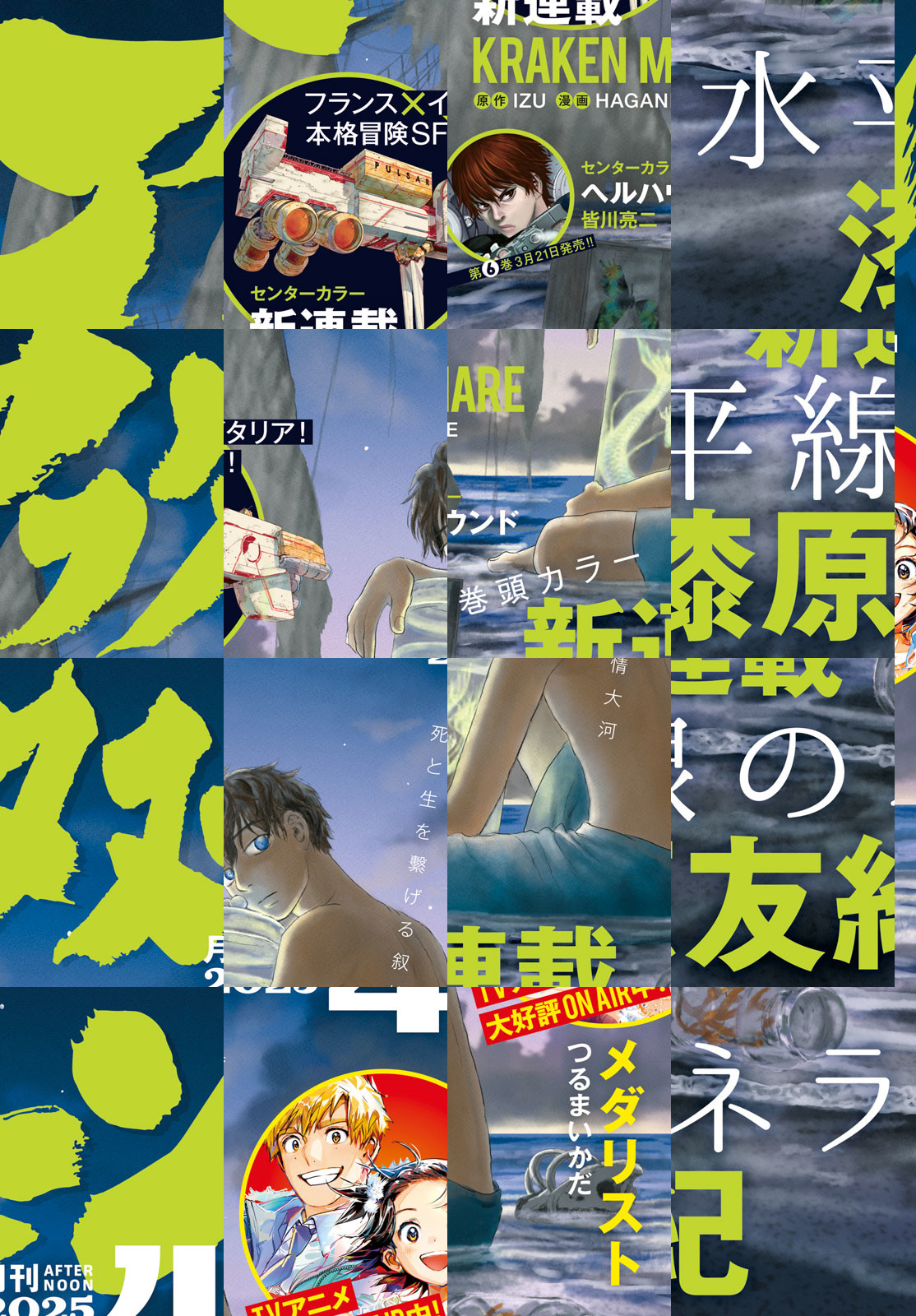 アフタヌーン4月号、表紙&巻頭カラーは『蟲師』の漆原友紀待望の新作『水平線のネラ』一挙108ページ掲載!海と人魚をめぐる幻想譚! 巻中カラーは新作2本目!伊×仏タッグが贈るスペースオペラ『KRAKEN MARE』(IZU×Hagane)開幕!ブラックホールの限界領域から違法にエネルギーを採取する海賊船から物語は始まる! 別フレから『狸田先輩の青春になりたい』(大鳥いと)出張掲載!狸田先輩、超絶かわいい! TVアニメ絶好調放映中の『メダリスト』(つるまいかだ)、光大滑走! 今号も目一杯!