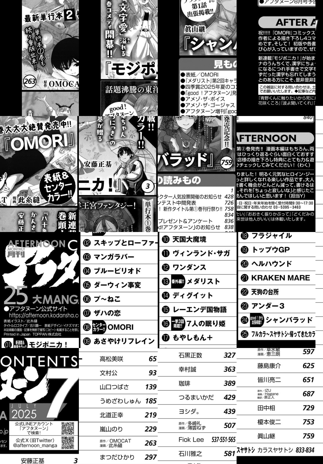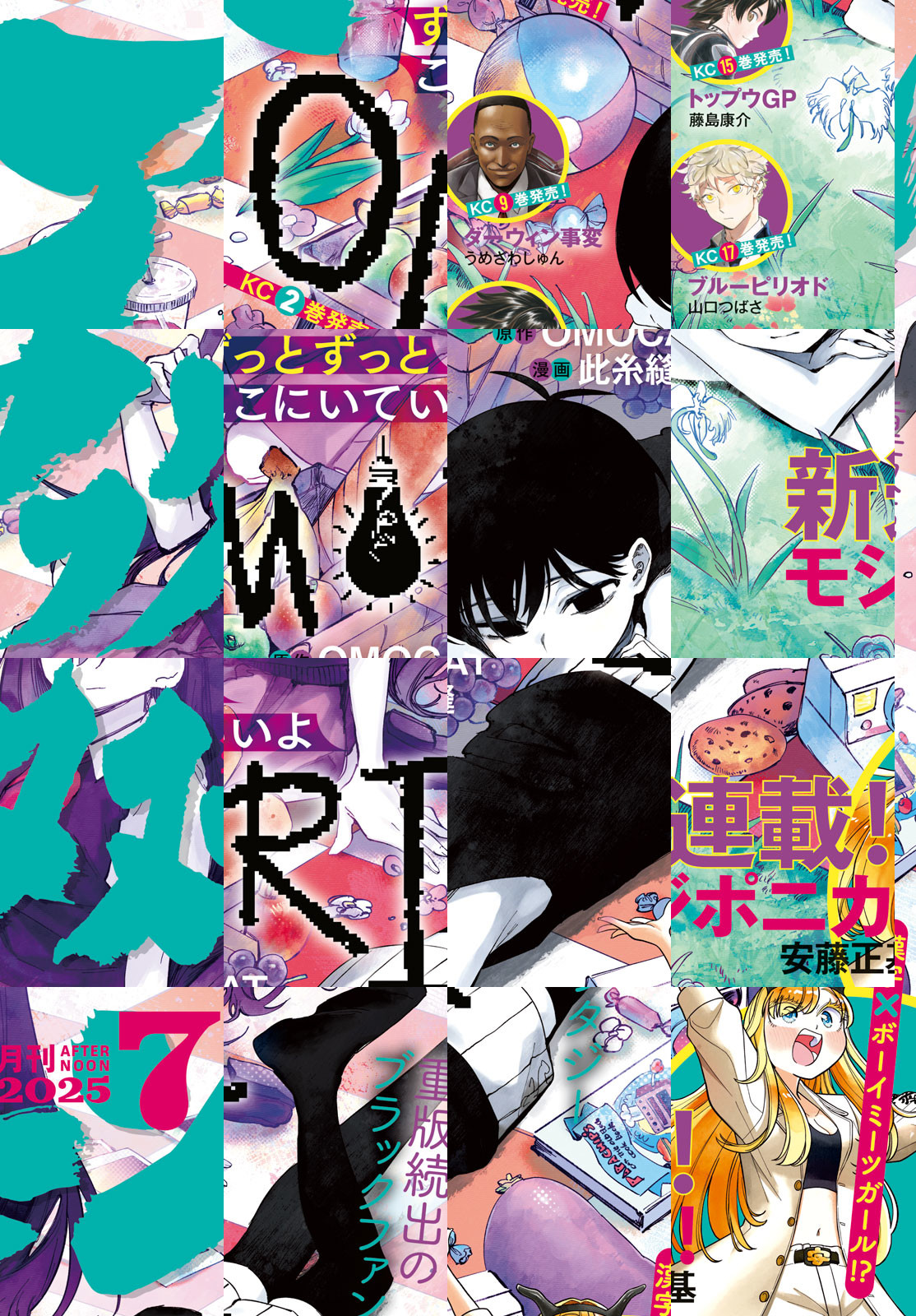 アフタヌーン7月号、表紙は単行本2巻が5月22発売の『OMORI』(OMOCAT×此糸縫)!物語は核心へ接近! 『八十亀ちゃんかんさつにっき』の安藤正基が漢字×刺繍愛を全力投球!『モジポニカ!』巻頭カラーで新連載! 単行本9巻が5月22日発売の『ダーウィン事変』(うめざわしゅん)、オメラスのルーツに迫る! 同じく単行本17巻が5月22発売の『ブルーピリオド』(山口つばさ)、グループ展開催! 『ディグイット』(ヨシダ。)、『マンガラバー』(文村公)、話題沸騰新連載第2回!