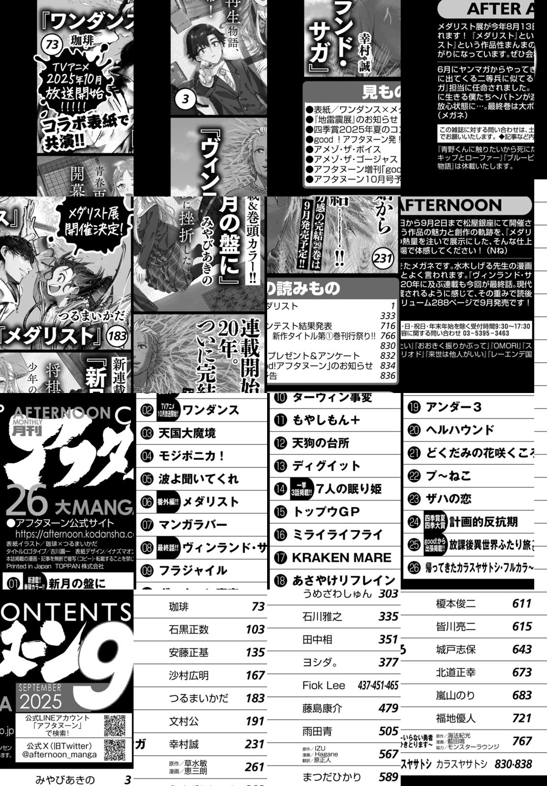 アフタヌーン9月号、表紙は10月アニメOAの『ワンダンス』(珈琲)と8/13~9/2松屋銀座でメダリスト展開催の『メダリスト』(つるまいかだ)コラボ表紙! 巻頭カラーは新連載『新月の盤に』(みやびあきの)!奨励会を退会してから始まる高校生青春将棋ライフ! 7/23単行本2巻発売の『ミライライフライ』(雨田青)は中国同人誌事情を活写! そして!20年に及ぶ歴史巨編に幕!『ヴィンランド・サガ』(幸村誠)最終回! 新連載攻勢中に巨編完結の真夏のアフタヌーン!