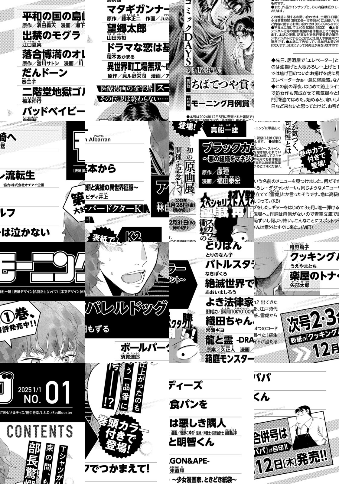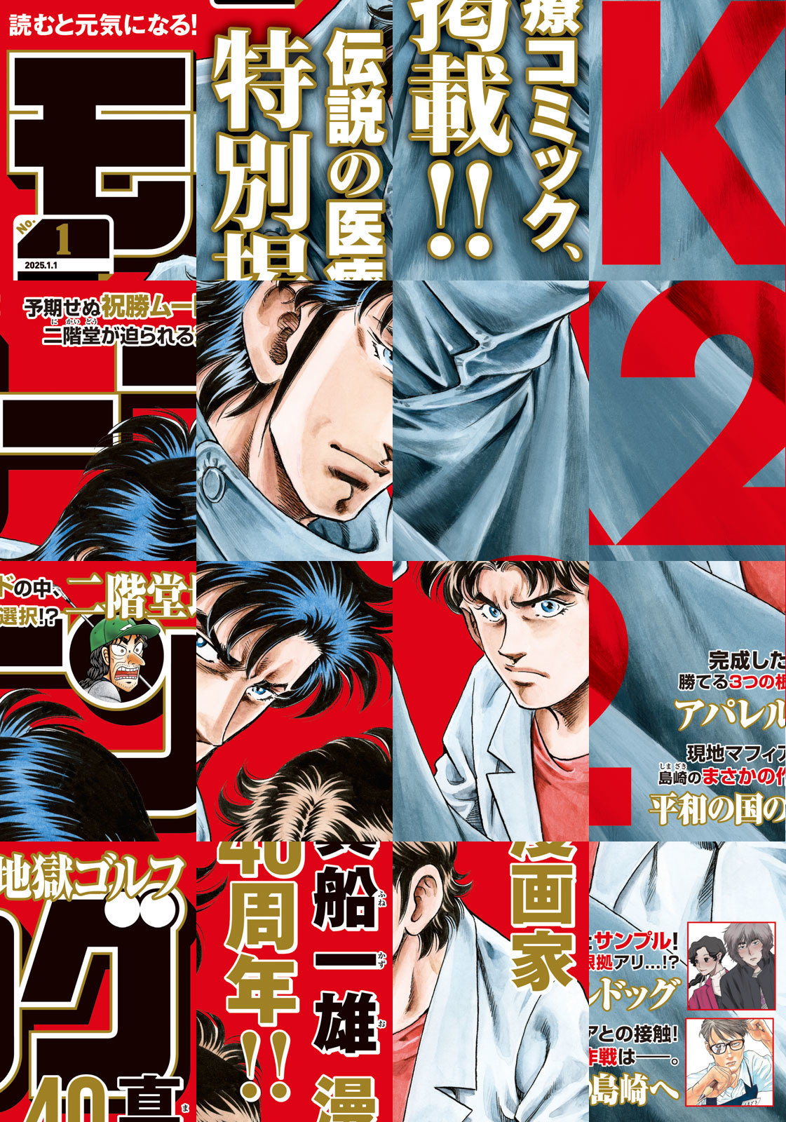 ◎『アパレルドッグ』は巻頭カラー付きで登場! 第1巻、大好評発売中!! Tシャツが仕上がったのも束の間、もう一品番に部長驚愕――!? ◎『K2』は表紙で登場! 医療漫画の金字塔『スーパードクターK』。その伝説は終わらない……! 初の原画展開催を記念してコミックDAYSより出張掲載!◎『ブラックカラー ~悪の組織をマネジメント~』は巻中カラー付きで登場!人材スペシャリスト×戦隊スペクタクル、連載再開!! スガワラが気づく、衝撃の可能性とは――。 ※作品ラインナップは、紙の「モーニング」に準拠しておりますが、一部、異なる場合があります。