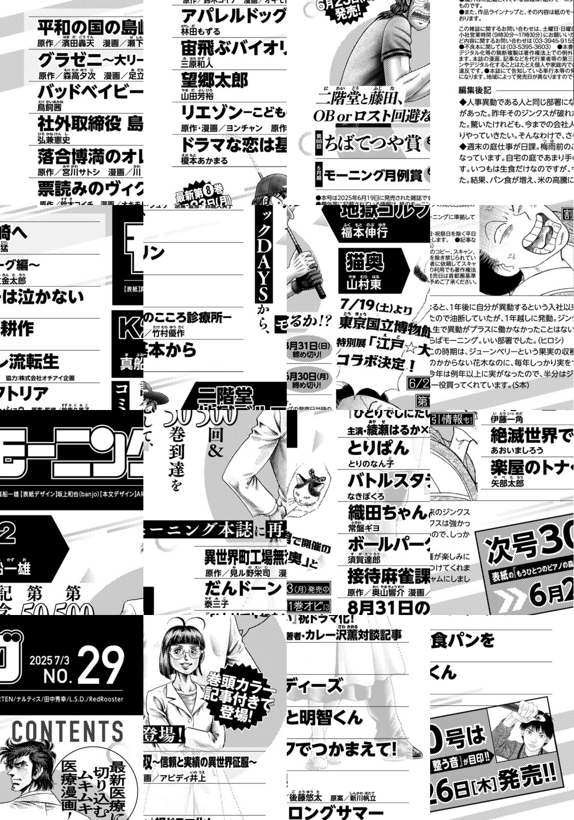 ◎『K2』は第500回&第50巻到達を記念して、巻頭カラー記事付きでコミックDAYSから出張掲載! ついに結ばれた一也と詩織は、詩織の実家へ2人でご挨拶に行くことに…! ◎『二階堂地獄ゴルフ』は最新第8巻が6月23日(月)に発売! 二階堂と藤田、OB or ロスト回避なるか!? ◎『猫奥』は最新第11巻が6月23日(月)に発売!今日も今日とて吉野ちゃんに会いたい滝山。疫病を払うための行事・御嘉祥でハプニング発生? ※作品ラインナップは、紙の「モーニング」に準拠しておりますが、一部、異なる場合があります。