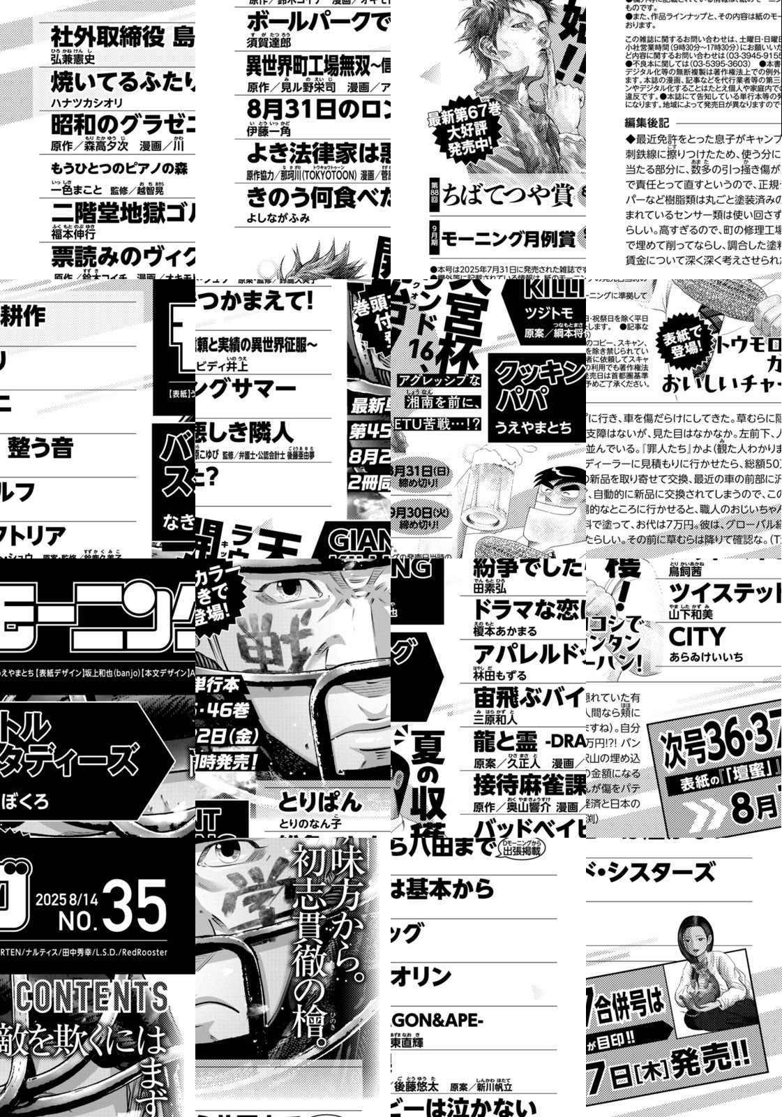 ◎『バトルスタディーズ』は巻頭カラー付きで登場! 敵を欺くにはまず味方から。初志貫徹の檜。最新単行本第45・46巻8月22日(金)2冊同時発売! ◎『GIANT KILLING』は最新第67巻大好評発売中! 天宮杯ラウンド16、開始!! アグレッシブな湘南を前に、ETU苦戦…!? ◎『クッキングパパ』は表紙で登場! 夏の収穫! トウモロコシでカンタンおいしいチャーハン! ※作品ラインナップは、紙の「モーニング」に準拠しておりますが、一部、異なる場合があります。