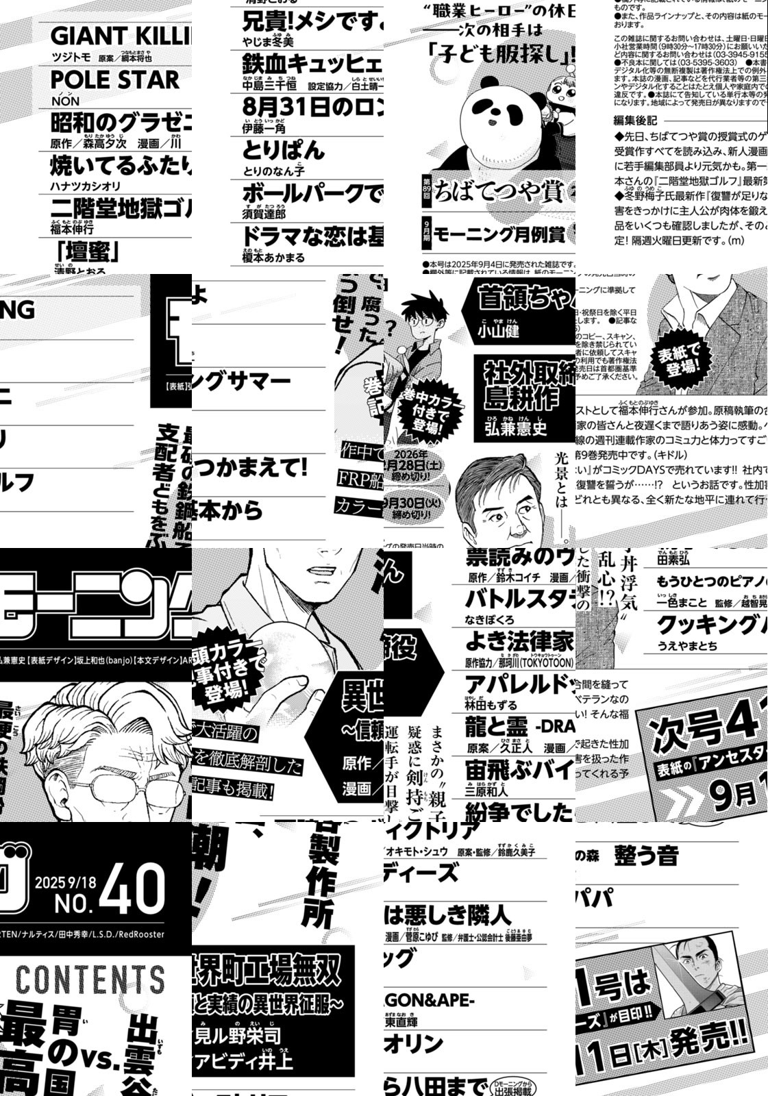 ◎『異世界町工場無双 ~信頼と実績の異世界征服~』は 出雲谷製作所vs.胃の国、最高潮! 最硬の鉄鋼船で、腐った支配者どもをぶっ倒せ! 作中で大活躍のFRP船を徹底解剖した巻頭カラー記事も掲載! ◎『社外取締役 島耕作』は表紙で登場! まさかの“親子丼浮気”疑惑に剣持ご乱心!? 運転手が目撃した衝撃の光景とは──。 ◎『首領ちゃん』は巻中カラー付きで登場! “職業ヒーロー”の休日──次の相手は「子ども服探し」!? ※作品ラインナップは、紙の「モーニング」に準拠しておりますが、一部、異なる場合があります。