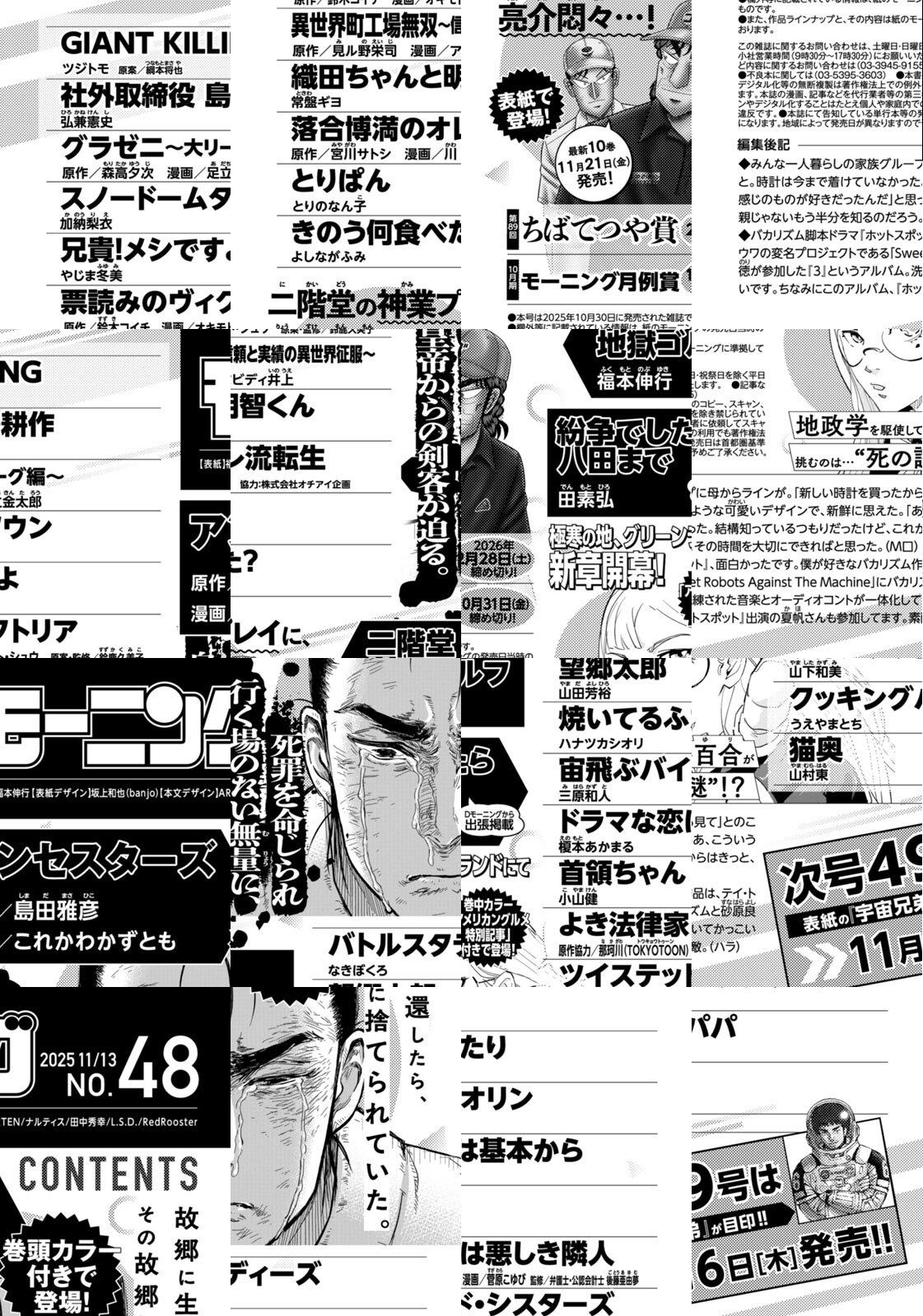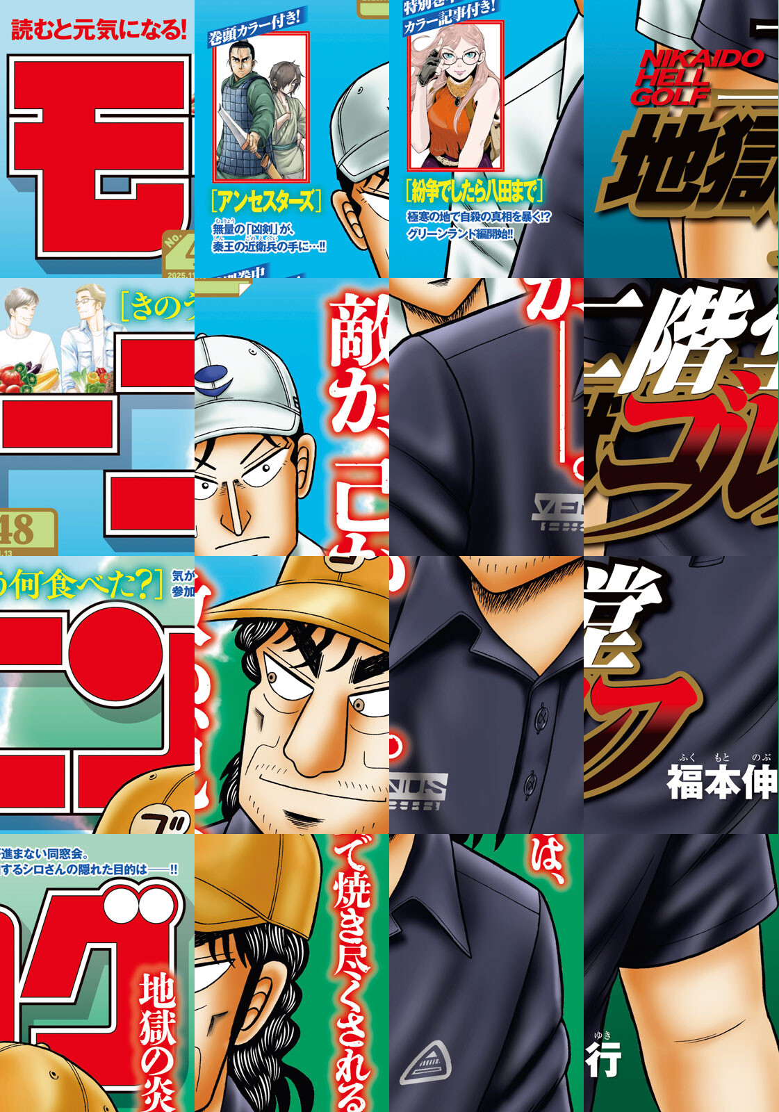 ◎『アンセスターズ』は巻頭カラー付きで登場! 故郷に生還したら、その故郷に捨てられていた。死罪を命じられ行く場のない無量に、皇帝からの剣客が迫る。◎『二階堂地獄ゴルフ』は表紙で登場! 二階堂の神業プレイに、亮介悶々…! 最新10巻は11月21日(金)発売! ◎『紛争でしたら八田まで』は巻中カラー「アメリカングルメ特別記事」付きで登場! 極寒の地、グリーンランドにて新章開幕! 地政学を駆使して百合が挑むのは…“死の謎”!? ※作品ラインナップは、紙の「モーニング」に準拠しておりますが、一部、異なる場合があります。