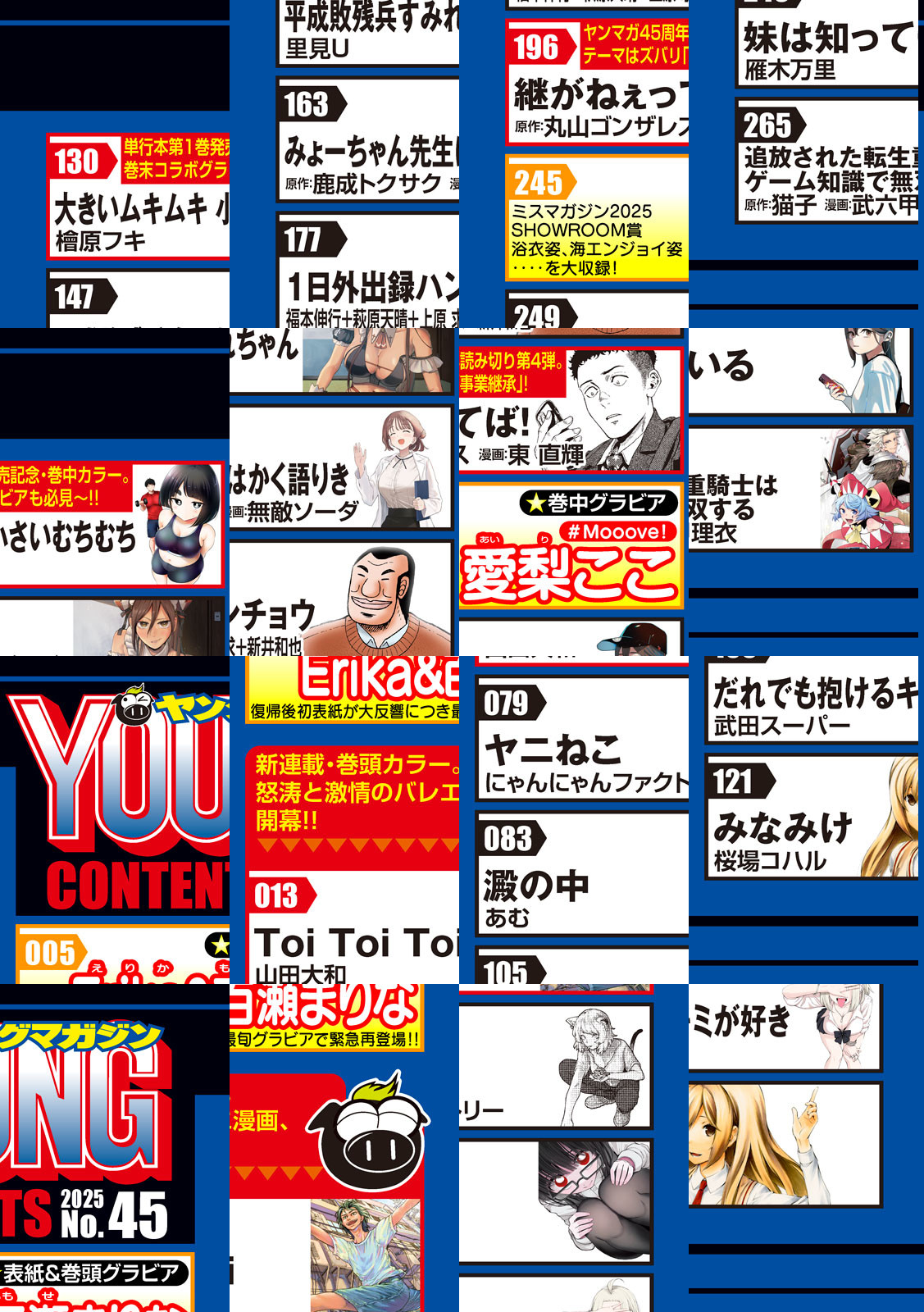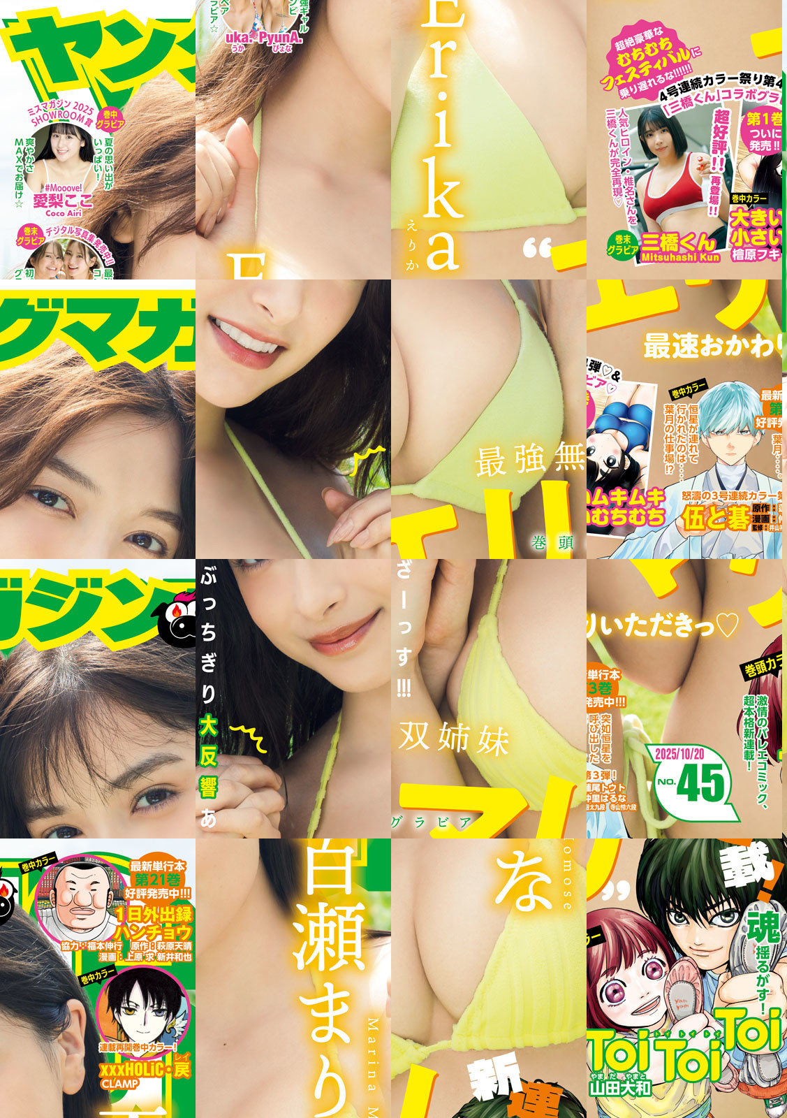 〈巻頭カラー〉『Toi Toi Toi』山田大和 熱くて、泣けて、笑えて、アツい。 怒涛と激情のバレエ漫画、開幕!親がいない兄妹は、繁華街で息を潜めて暮らしていた。生きる希望もなく、運命を諦めていた。あの日、その男に出会うまでは‥‥。〈巻中カラー〉『伍と碁』原作:蓮尾トウト 漫画:仲里はるな 監修:井山裕太九段 寺山怜六段 恒星が零したプロに対する本音。それを聞き、恒星を呼び出した葉月、その意図とは‥‥!?『大きいムキムキ小さいむちむち』檜原フキ 単行本発売前記念!!4号連続カラー祭り第4弾☆むちむち好きのみんな待たせたな!!第1巻ついに発売!!巻末グラビアではSNSを席巻するグラドル「三橋くん」とのコラボグラビアも★超絶豪華なビッグウェーブに乗り遅れるな!!『xxxHOLiC・戻〈レイ〉』CLAMP 連載再開センターカラー!店主代理の四月一日から頼まれた「お使い」!百目鬼と管狐は、何を拾って帰るのか!?〈巻頭グラビア〉「Erika&百瀬まりな」復帰後”初表紙”が大反響につき♪最旬グラビアで緊急再登場──ッ!〈巻中グラビア〉「愛梨ここ(#Mooove!)」ミスマガジン2025 SHOWROOM賞浴衣姿&海エンジョイ姿&和室まったり姿&入浴姿を大収録!〈巻末グラビア〉「PyunA.uka.」デジタル写真集発売!仲良しギャルコンビの初ペアグラビアを見逃すなッ☆「三橋くん」祝・単行本第1巻発売記念『大きいムキムキ小さいむちむち』スペシャルコラボ!!人気ヒロイン・椎名さんを完全再現!!