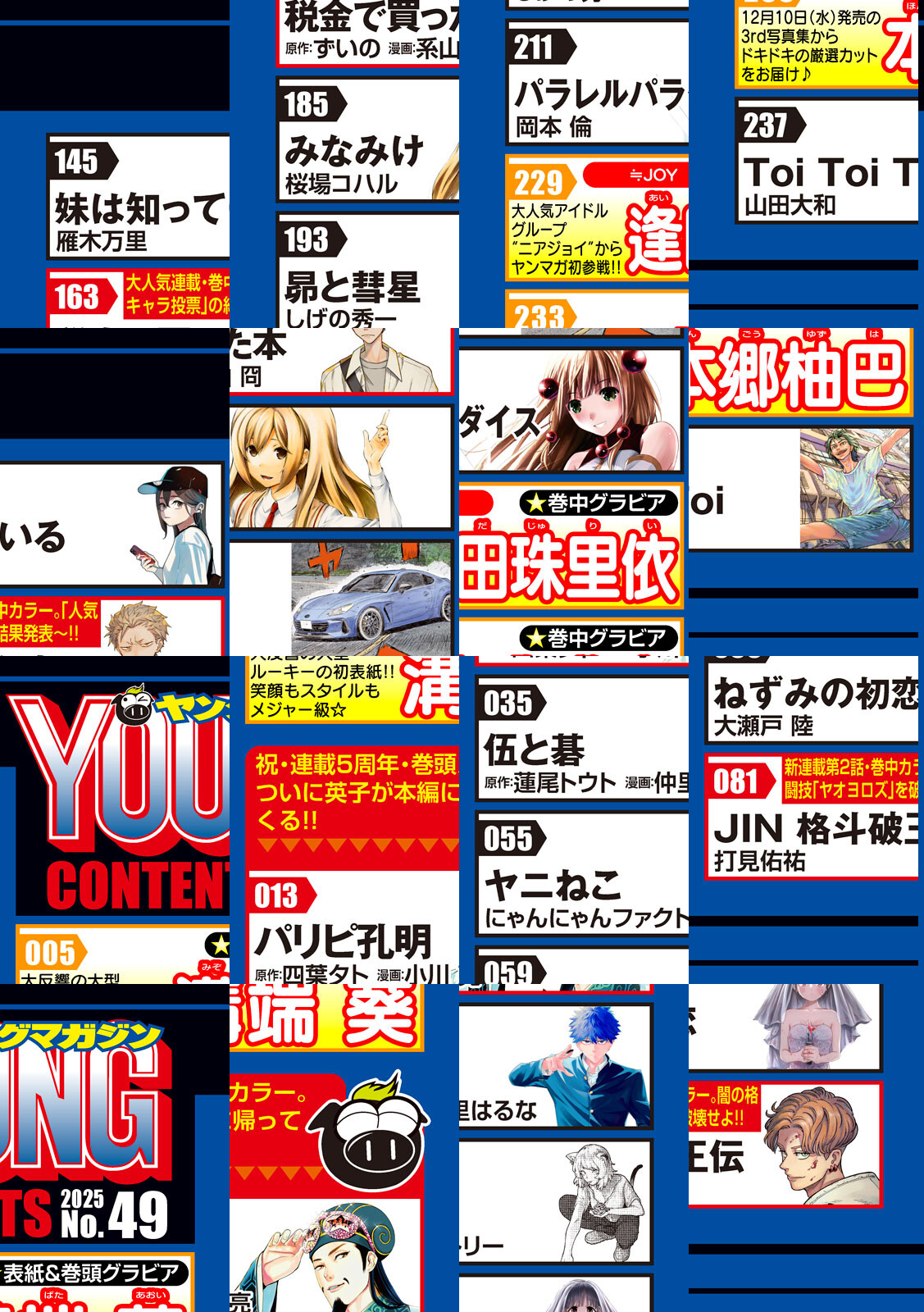〈巻頭カラー〉『パリピ孔明』原作:四葉夕ト 漫画:小川 亮 祝!連載5周年!!ご愛読いただきマジ感謝!!5周年記念イヤー企画ラストは豪華描きおろし巻頭カラー!!すべてはココから始まった‥‥。そして、ついに来週は英子が本編に帰ってくる!!すっかり時の人となった英子。しかし、忍び寄る「アニメの人」レッテル問題‥‥。〈巻中カラー〉『xxxHOiC戻〈レイ〉』CLAMP 超・久しぶり!最新単行本発売記念カラー!座敷童救出シリーズ、クラマックス!百目鬼と無月の"お使いコンビ"は無事帰宅できるのか!?『ジン格斗破王伝』打見佑祐 新連載第2話も大増63P!!!闇の格闘技「ヤオヨロズ」を破壊せよーー。最恐素人、大暴れッ!!!!『税金で買った本』原作:ずいの 漫画:系山 冏 「人気キャラ投票」のご協力ありがとうございましたッ!いよいよ結果発表!お楽しみに!〈巻頭グラビア〉「溝端葵」大反響の超大型ルーキー、ついに初表紙!!!笑顔もスタイルもメジャー級の葵ちゃんに、みんながゾッコンです☆〈巻中グラビア〉「≒JOY 逢田珠里依」大人気アイドルグループ"ニアジョイ"からヤンマガ初参戦っ!!