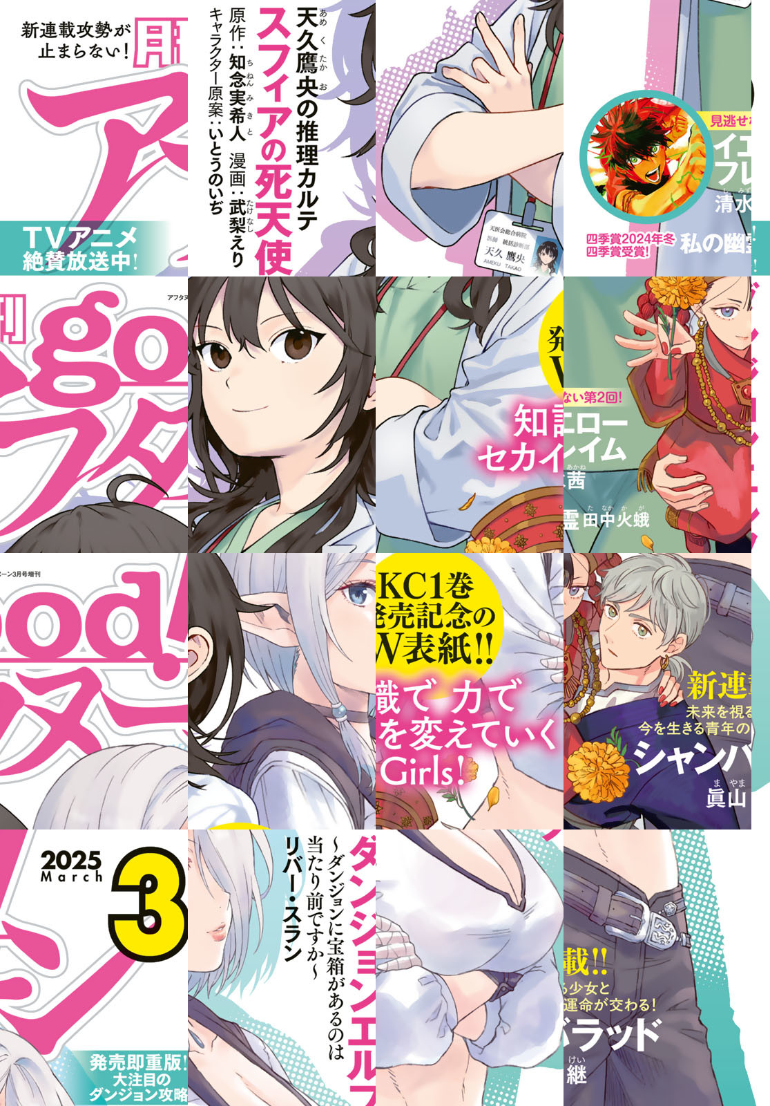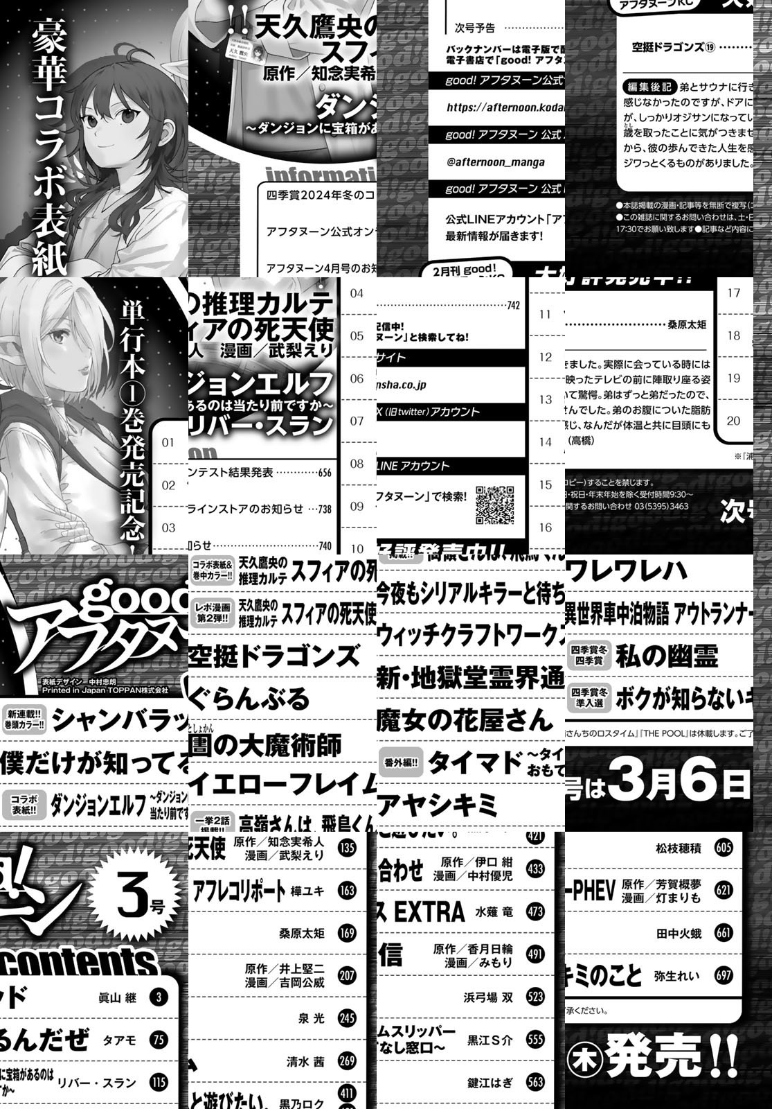 good!アフタヌーン2025年3号の表紙は、単行本1巻が発売即重版! 大好評の『天久鷹央の推理カルテ スフィアの死天使』(知念実希人 武梨えり)と『ダンジョンエルフ ~ダンジョンに宝箱があるのは当たり前ですか~』(リバースラン)のW表紙! 巻頭カラーは新連載『シャンバラッド』(眞山継)。国を司る生き神・アムリタと山岳育ちの正義感あふれる青年・ラジャンがおりなす華麗なるオリエンタルファンタジーが開幕! 連載2話目『イエローフレイム』(清水茜)は142ページの大ボリュームでお届け! 藤島康介氏選考の2024年冬の四季賞『私の幽霊』(田中火蛾)、準入選『ボクが知らないキミのこと』(弥生れい)を掲載! *電子配信版は通信環境によりダウンロードに時間がかかる場合がございます。