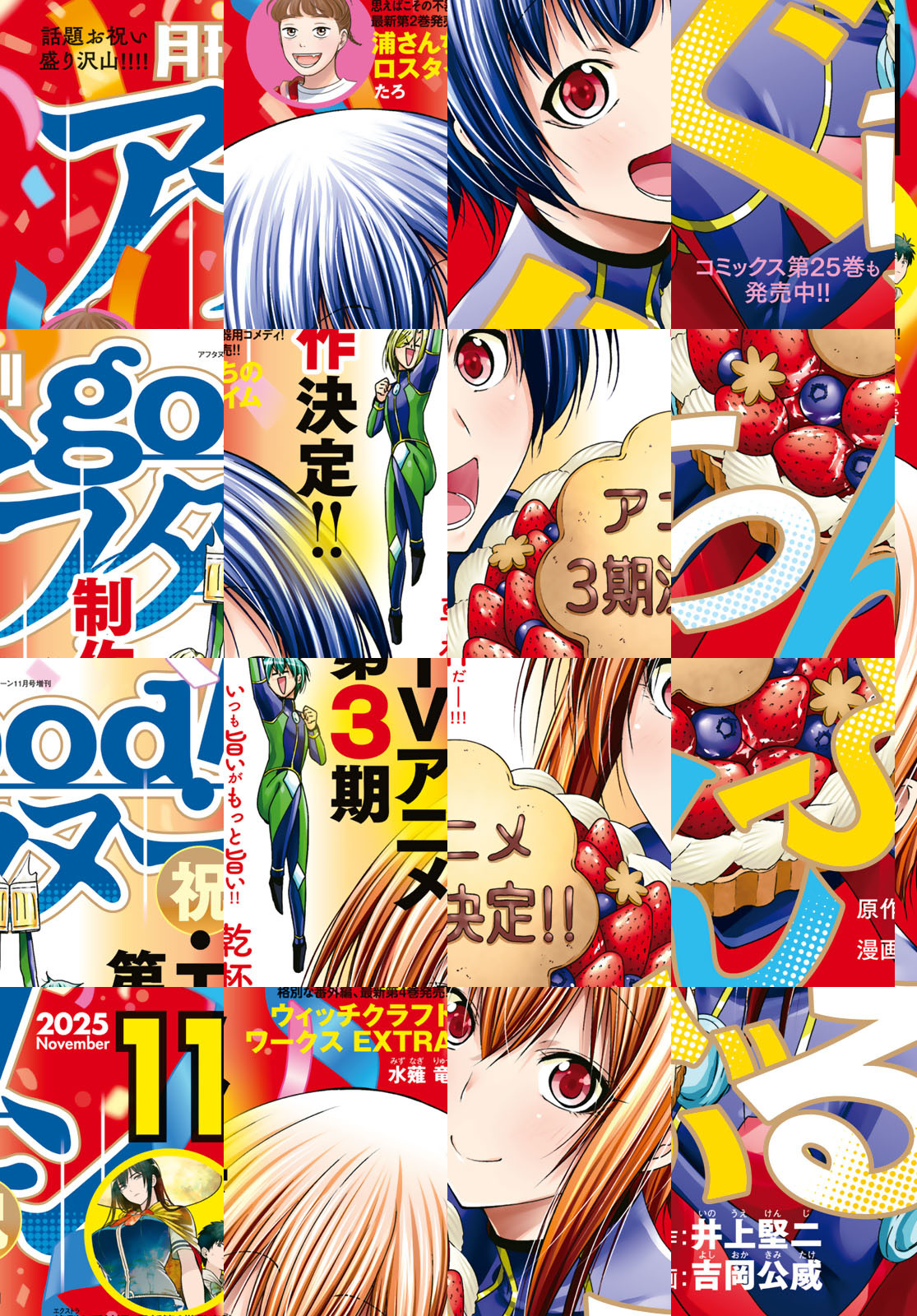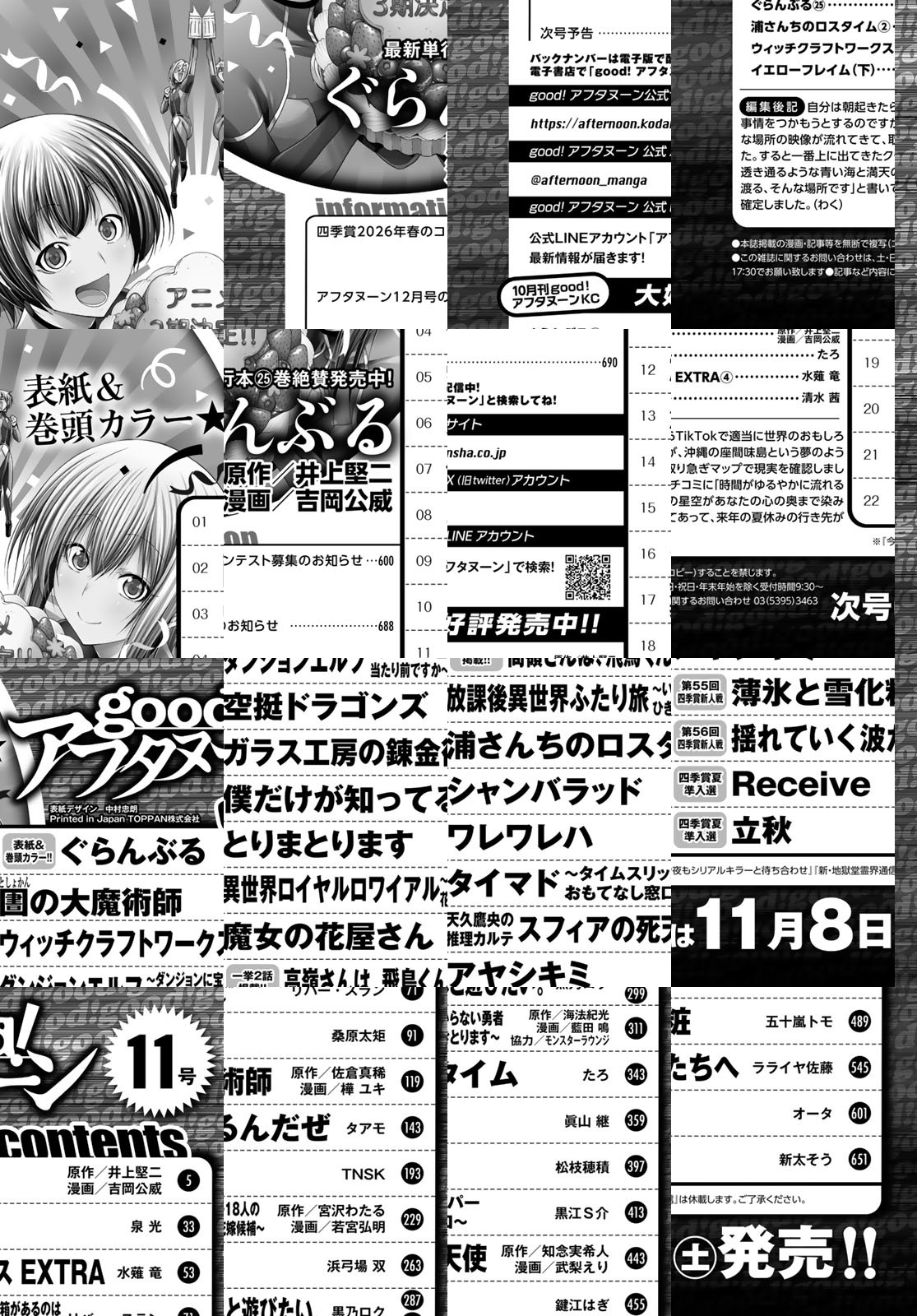 good!アフタヌーン2025年11号の表紙&巻頭カラーは、最新単行本25巻が発売された『ぐらんぶる』(井上堅二 吉岡公威)。重大発表付きのカラー記事にもご注目を! 『ウィッチクラフトワークスEXTRA』(水薙竜)は最新単行本4巻発売! そして『裏さんちのロスタイム』(たろ)は、最新単行本2巻発売! 新鋭読み切り続々登場! 四季賞新人戦『薄氷と薄化粧』(五十嵐トモ)、『揺れていく波たちへ』(ラライヤ佐藤)、森薫氏選考の2025年夏の四季賞準入選受賞作『Receive』(オータ)、『立秋』(新太そう)を掲載! *電子配信版は通信環境によりダウンロードに時間がかかる場合がございます。
