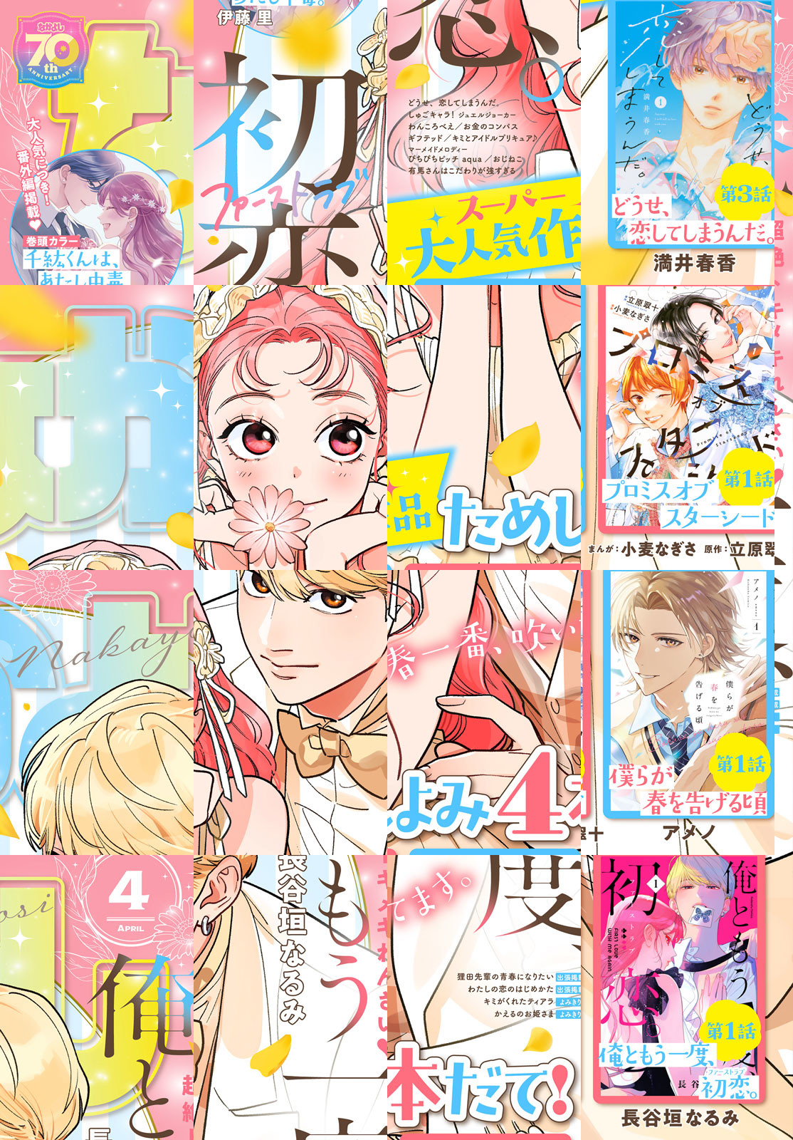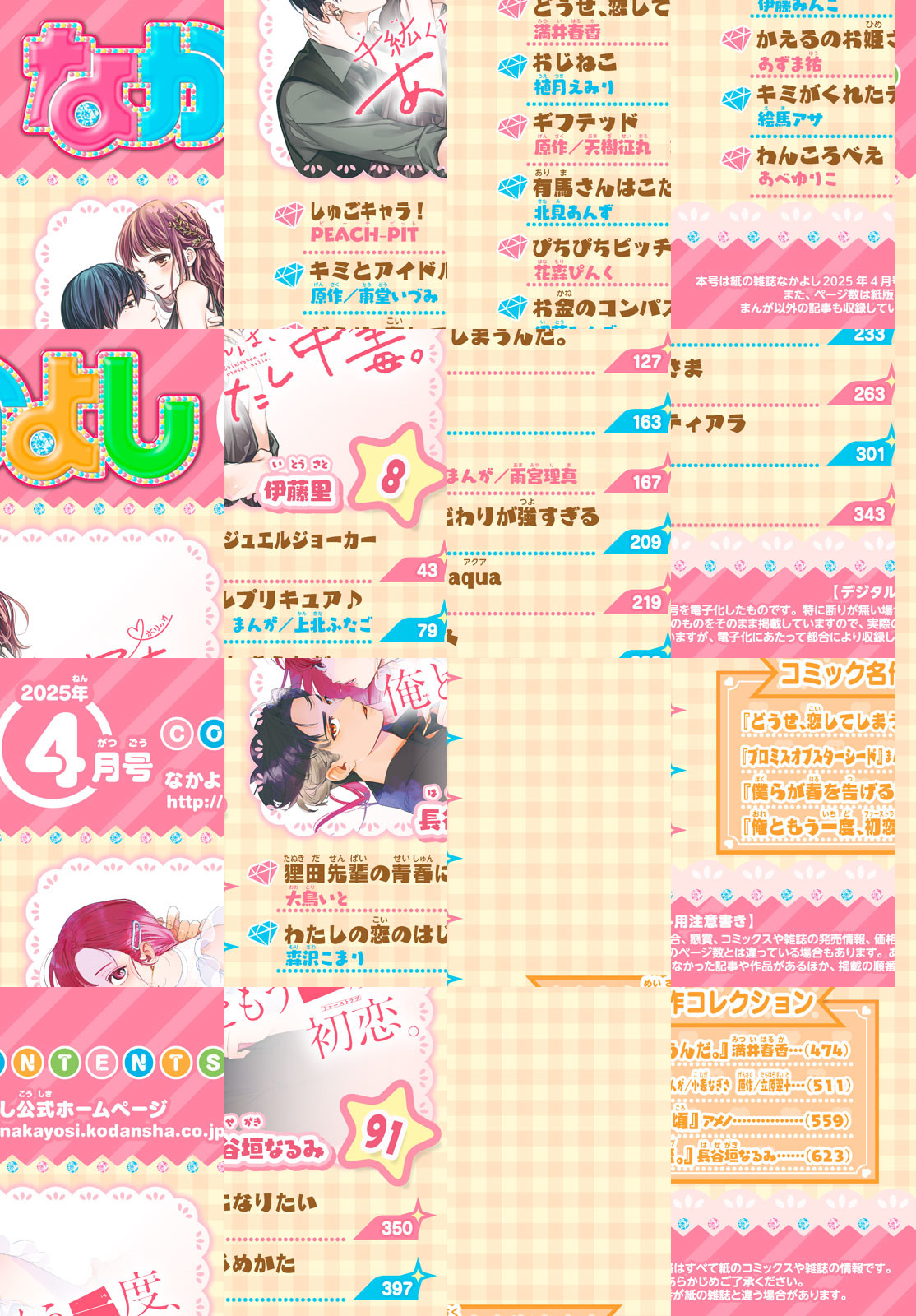3月3日(月)発売のなかよし4月号は春らんまん! 表紙は『俺ともう一度、初恋。』! ドキドキの展開から目が離せない…! 『千紘くんは、あたし中毒。』番外編が巻頭カラーで登場。千紘と未知たちの未来は…!? さらに、第79回なかよし新人まんが賞佳作受賞作の『かえるのお姫さま』&『キミがくれたティアラ』が2作同時掲載!! いろんな作品に出会えちゃう4月号、お楽しみに! ※付録の「恋しま 切手風シール4枚セット」やプレゼントページ、一部の記事は電子版には付きません。