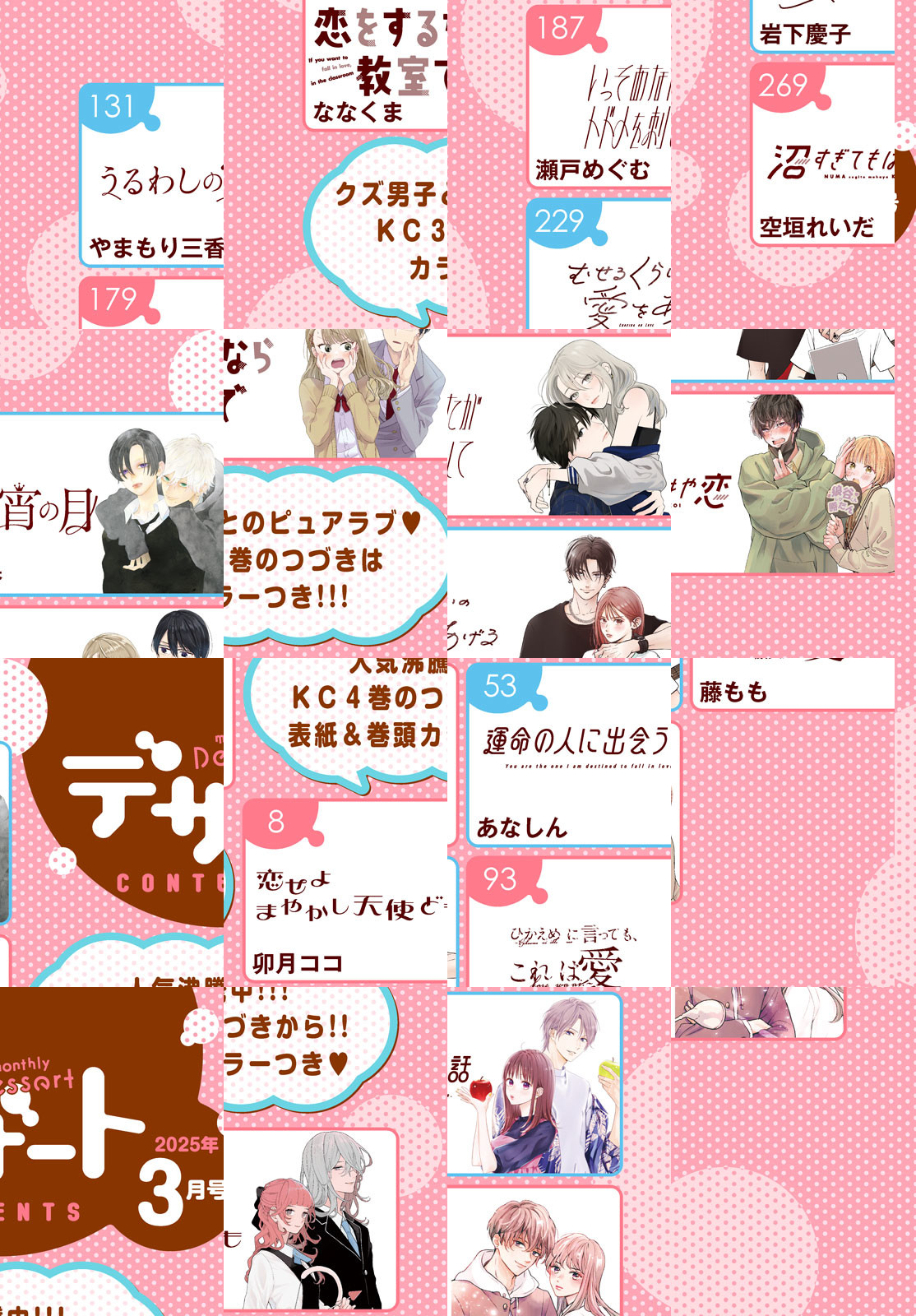 コミックスが大ヒット! 『恋せよまやかし天使ども』が表紙&巻頭カラーで登場! さらに、『うるわしの宵の月』『運命の人に出会う話』『恋せよまやかし天使ども』『花野井くんと恋の病』『ゆびさきと恋々』のSPフォト風カードが、どれか1種ランダム封入で付いてくる(紙版3月号のみ)! また最新巻が好評発売中の『いっそあなたがトドメを刺して』『おくれまして青春』がカラー付き&2作品合同の裏表紙も注目です!※内容の一部は、2025年4月22日までの閲覧期限となります。『むせるくらいの愛をあげる』『沼すぎてもはや恋』『東千石さんのメイクアップドール』が読めるのもデザートだけ!2025年もデザート3月号をよろしくお願いします!※電子版では、紙の雑誌と内容が一部異なる場合や、掲載されないページがあります。ご了承ください。※SPフォト風カードは電子版には付属いたしません。