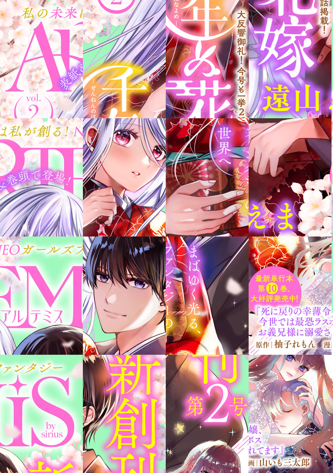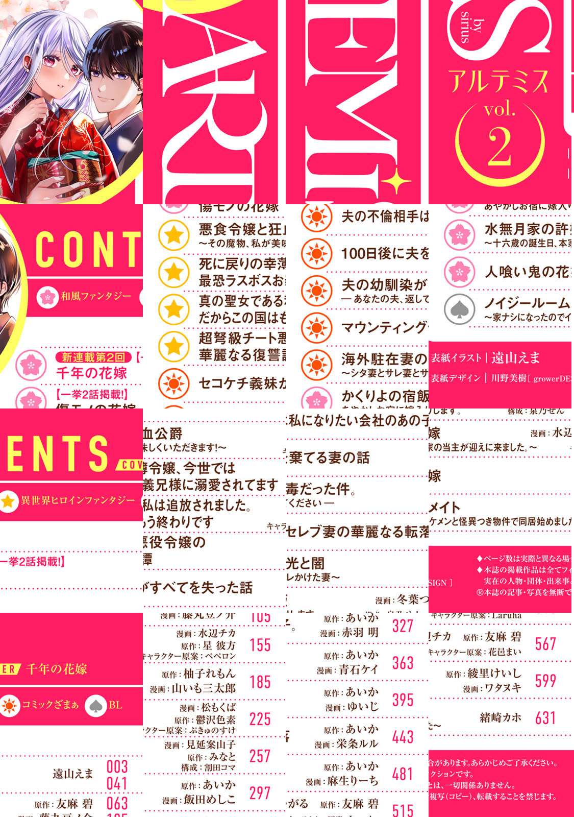 Vol.2表紙は連載第2回目の『千年の花嫁』! 今号も一挙2話掲載でお届け! 大ヒット作の『傷モノの花嫁』も一挙2話掲載の大ボリューム90ページ! 10月からアニメ放送予定の『悪食令嬢と狂血公爵』や、『死に戻りの幸薄令嬢、今世では最恐ラスボスお義兄様に溺愛されています』『かくりよの宿飯 あやかしお宿に嫁入りします。』『セコケチ義妹がすべてを失った話』などの大人気作も掲載!