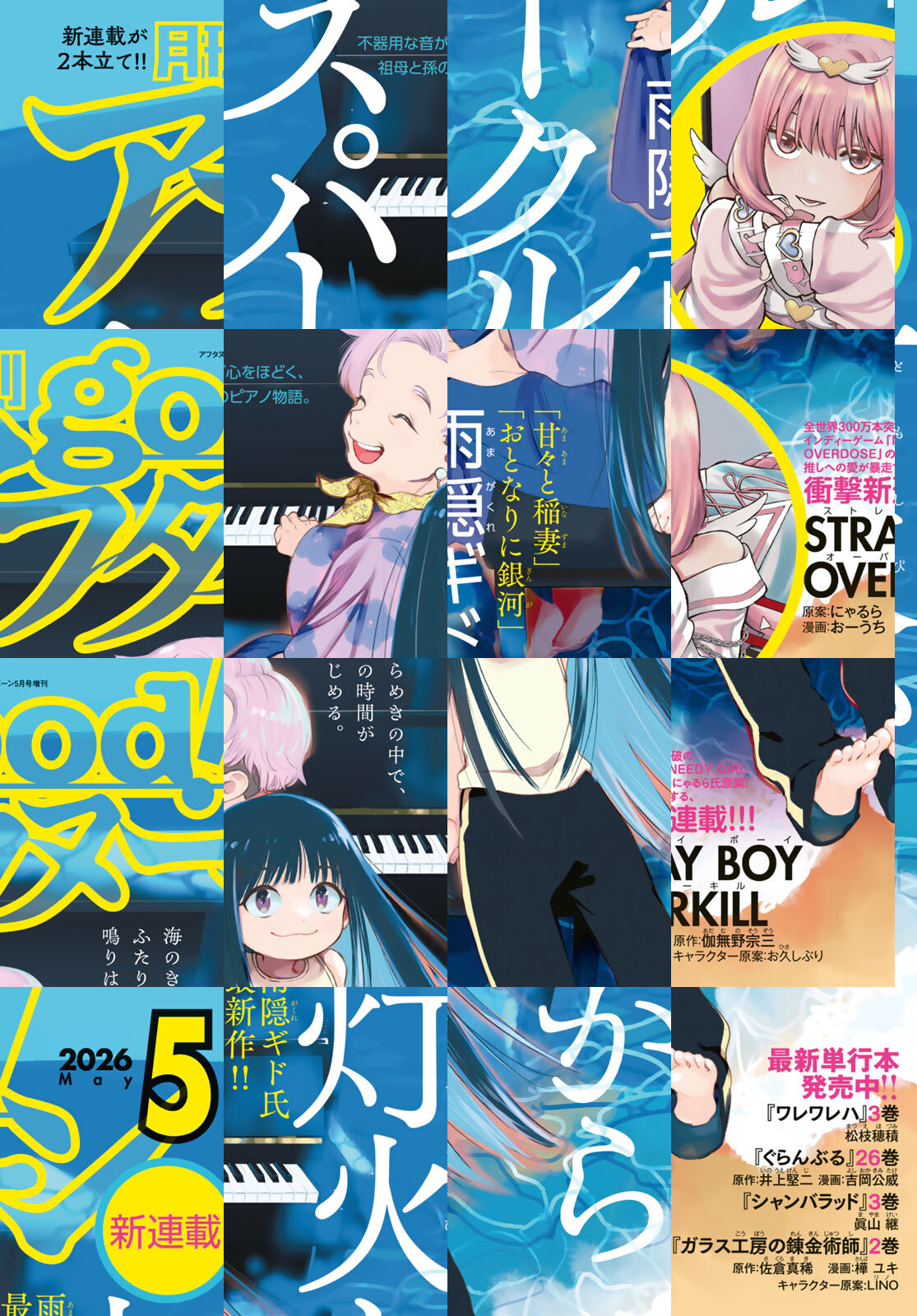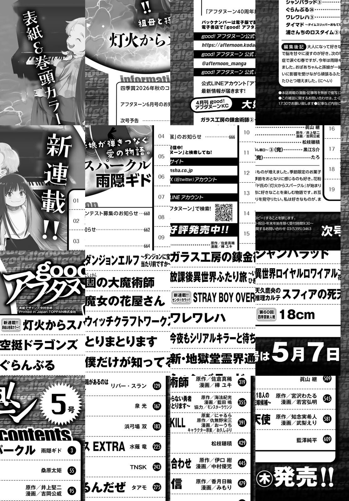 good!アフタヌーン2026年5号は巨弾新連載が2本始動! 新連載1本目は表紙&巻頭カラー『灯火からスパークル』(雨隠ギド)。『甘々と稲妻』、『おとなりに銀河』の雨隠さんがgood!に帰還! 不器用な音が心をほどく、祖母と孫のピアノ物語。もうひとつの新連載は『STRAY BOY OVERKILL』(仇無野宋三 おーうち)がカラー付きで開幕! 大ヒットインディーゲーム『NEEDY GIRL OVERDOSE』のにゃるら氏原案です。四季賞新人戦は、赤裸々ガールズトーク全開で困難なミッションに挑む『18cm』(藍澤純平)を掲載! *電子配信版は通信環境によりダウンロードに時間がかかる場合がございます。
