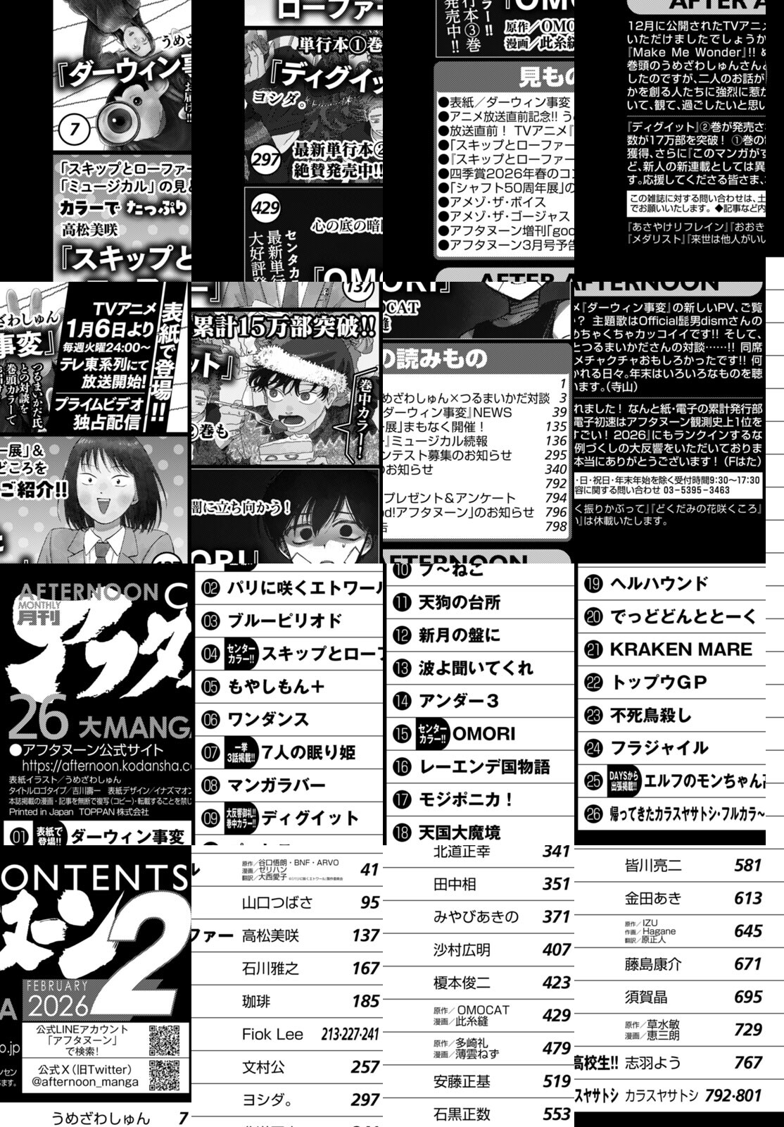 アフタヌーン2月号、表紙はアニメが1月6日(火)24:00よりテレ東系列で放送開始『ダーウィン事変』(うめざわしゅん)! 巻頭カラーはアニメ2期が1月24日(土)よりテレビ朝日系“NUMAnimation”枠ほかにて放送開始『メダリスト』つるまいかだ×うめざわしゅん特別対談! 巻中カラー(1)は1月2日~18日開催『スキップとローファー展』記事&3月6日~15日開演ミュージカル『スキップとローファー』記事! 巻中カラー(2)は12月23日単行本2巻発売の『ディグイット』(ヨシダ。)! お知らせ満載号!