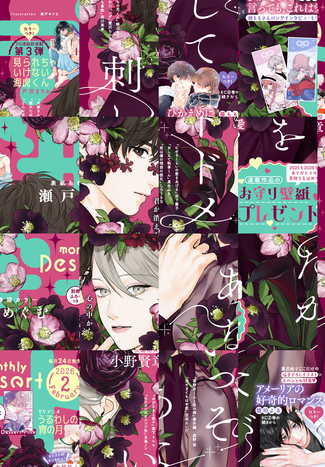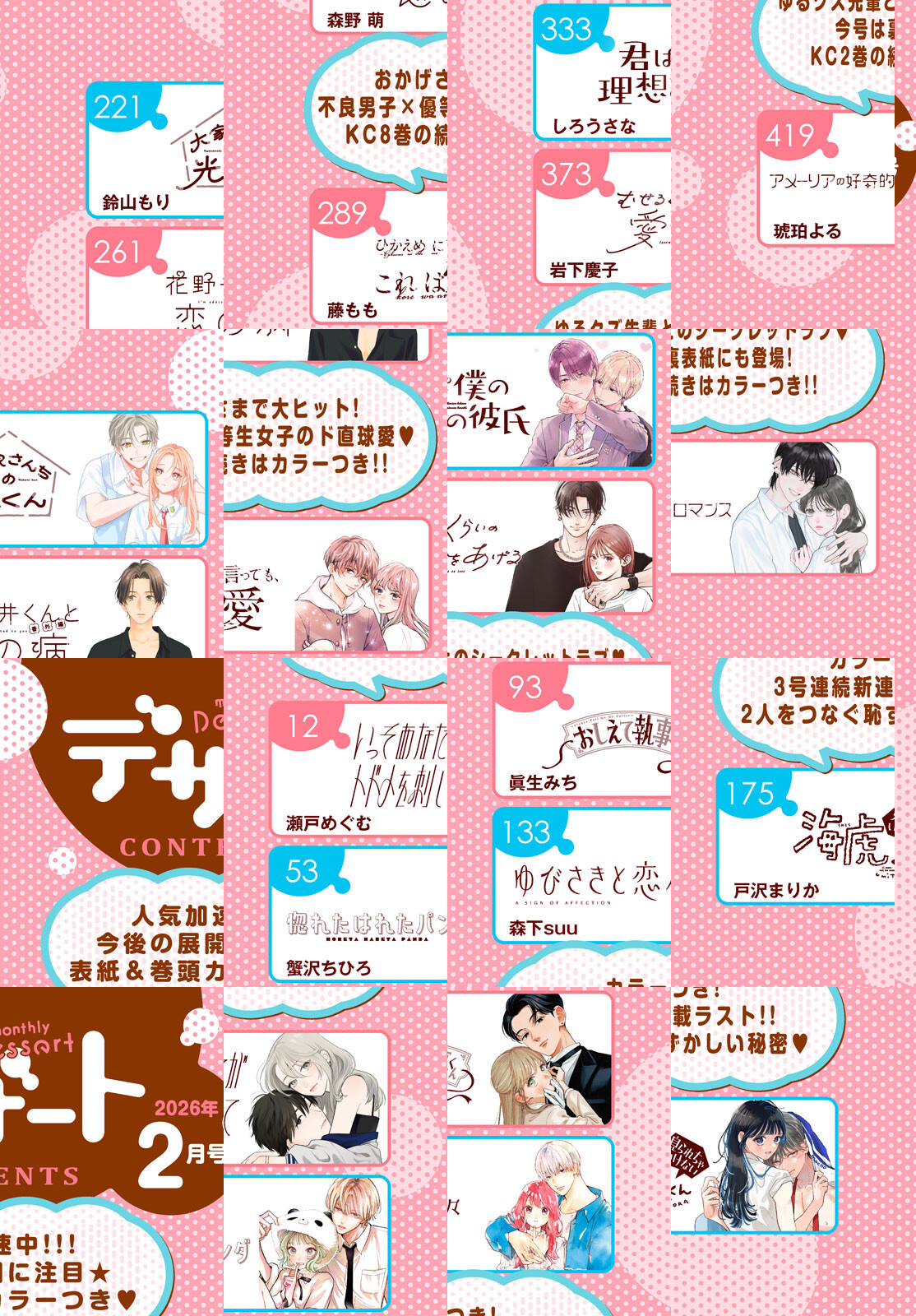 表紙&巻頭カラーは、5巻が大ヒット中の『いっそあなたがトドメを刺して』が初登場! 失恋を吹っ切ろうとする一香を支えたのは…? さらに大人気『ひかえめに言っても、これは愛』『アメーリアの好奇的ロマンス』がカラー付きで掲載★ 3号連続新連載のラストを飾るのは、戸沢まりか先生の『見られちゃいけない海虎くん』です。2人をつなぐ恥ずかしい秘密とは? さらにさらにデザートから今年1年の感謝を込めて、お守り壁紙企画を実施! 人気作品がランダムで当たる超レア企画をお見逃しなく! 『おしえて執事くん』『むせるくらいの愛をあげる』『ゆびさきと恋々』が読めるのも、デザートだけ★ 別冊Pinkもついて、豪華特大号をクリスマスイブにお届けします(*^^*) ※電子版では、紙の雑誌と内容が一部異なる場合や、掲載されないページがあります。ご了承ください。