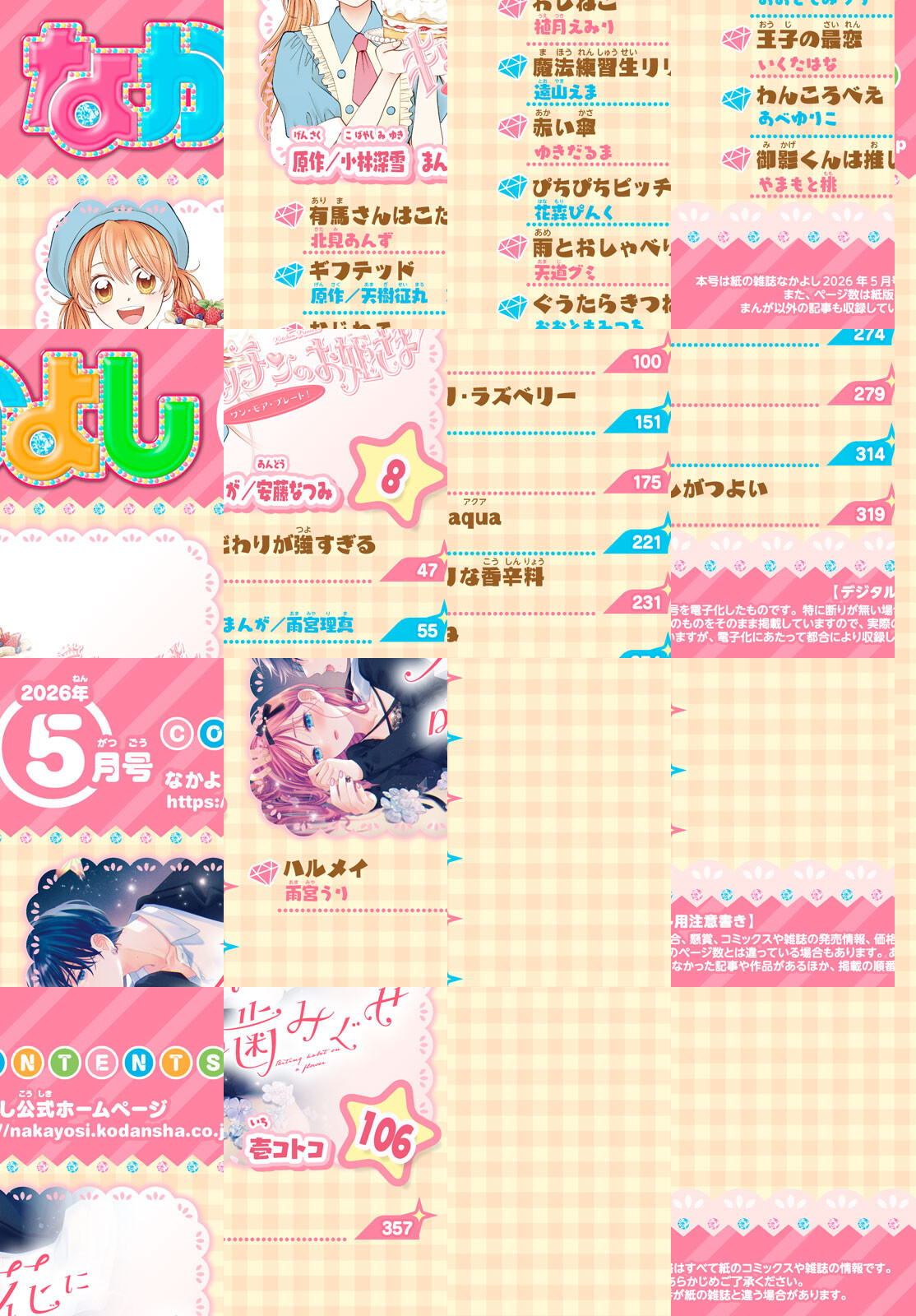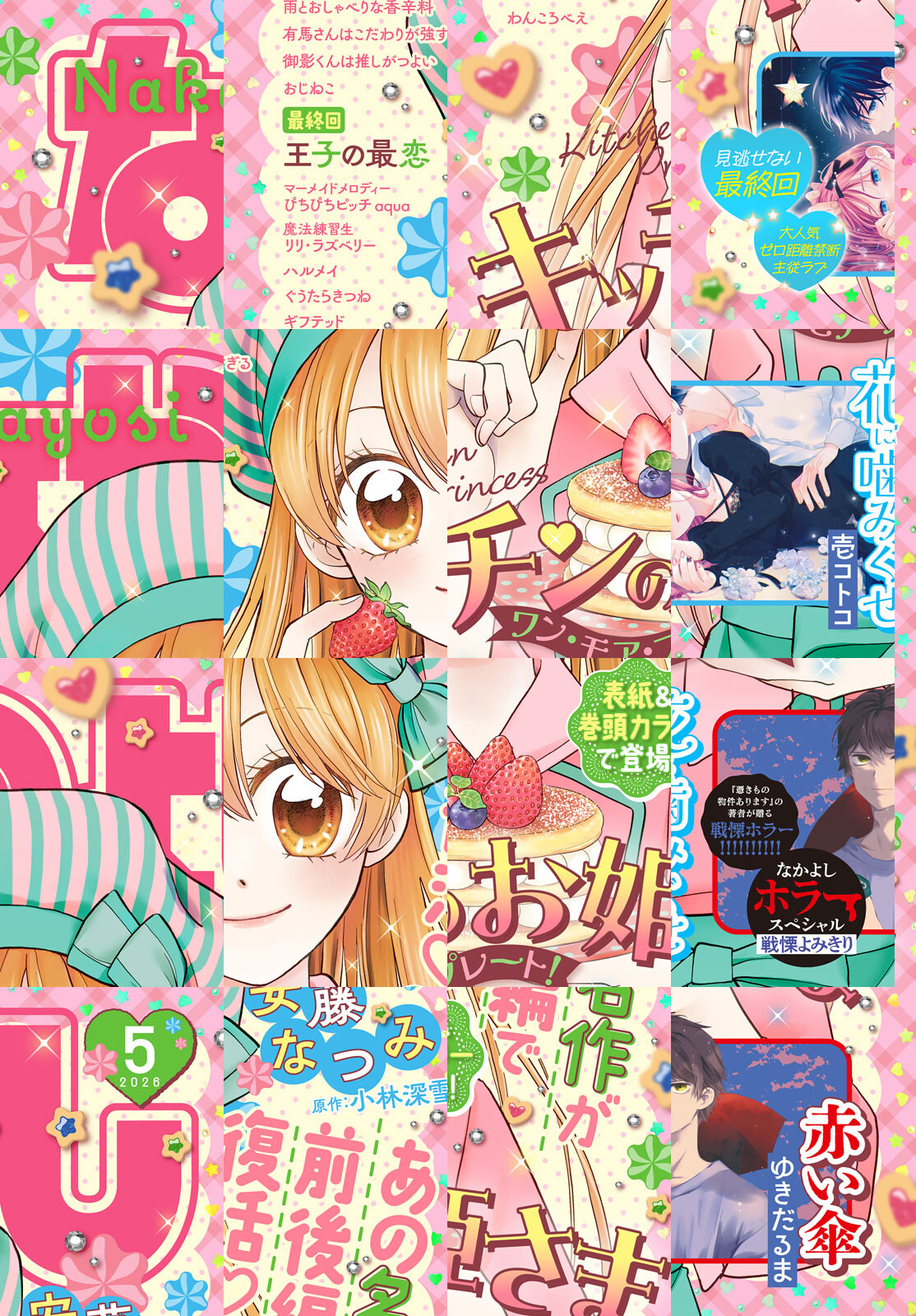 4月3日(金)発売のなかよし5月号は、新学期&新年度、踏み出すあなたを応援するラブ&エール号★おいしさと感動がいっぱいの名作『キッチンのお姫さま ワン・モア・プレート!』(原作:小林深雪、漫画:安藤なつみ)が前後編でカムバック!表紙&巻頭カラーを愛いっぱいに飾るよ!大人気のゼロ距離禁断主従ラブ『花に噛みぐせ』(壱コトコ)は見逃せない最終回!『マーメイドメロディーぴちぴちピッチaqua』(花森ぴんく)はコミックス7巻発売記念で美麗カラー付き♪さらに「怖すぎる」と大評判のなかよしホラースぺシャル第3弾を飾る『赤い傘』(ゆきだるま)も見逃せない!ドキドキの新学期、なかよしと一緒にテンションあげてこっ★なかよし5月号は4月3日(金)発売!※付録の「レジェンド☆クリアメッセージカード」やプレゼントページ、一部の記事は電子版には付きません。