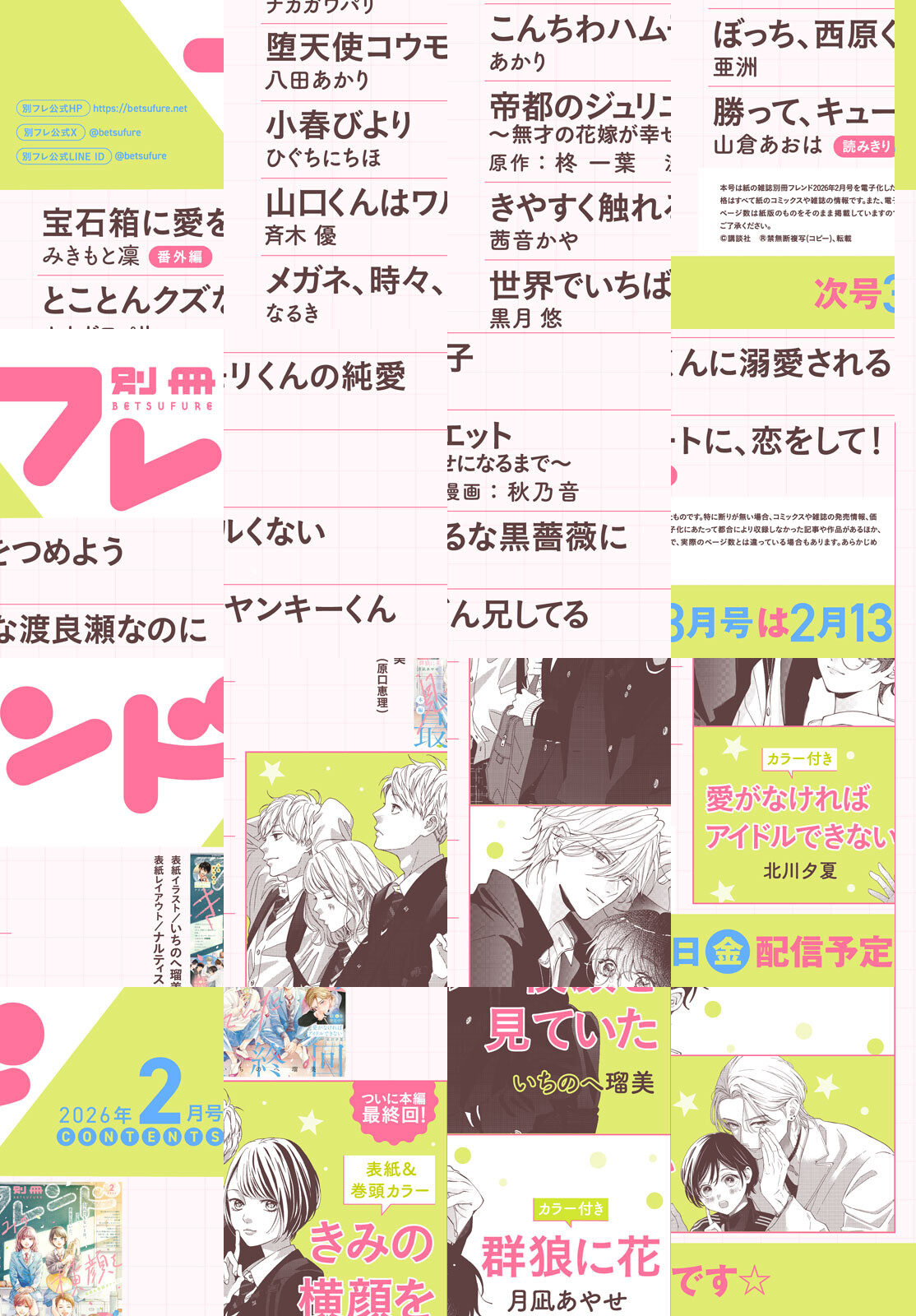 表紙&巻頭カラー『きみの横顔を見ていた』(いちのへ瑠美)は本編最終回! 高校生4人の眩しすぎる恋と青春の物語を見届けてください。 『愛がなければアイドルできない』(北川夕夏)は既刊ゾクゾク重版で絶好調! 最新4巻発売スタートでカラー扉付き☆ 乃愛イブキの恋とリヒトの想いは…!? 重版御礼!超人気『群狼に花』(月凪あやせ)もカラー扉で登場です! イケメン(ワルメン)たちの恋の矢印が少しずつ明らかに…!? 一生モノの恋と青春をお届けします! ※電子版では紙の雑誌と内容が一部異なる場合や、掲載されないページがあります。 ※内容の一部は、2026年4月13日までの閲覧期限となります。