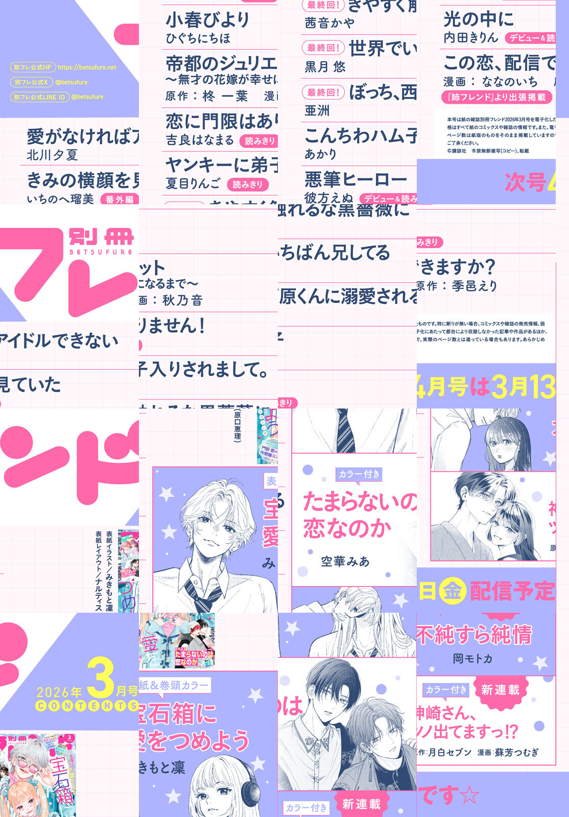 表紙&巻頭カラーは超人気『宝石箱に愛をつめよう』(みきもと凜)! 杏治との関係性にも少しずつ変化が訪れてーー? センターカラー『たまらないのは恋なのか』(空華みあ)はKC6巻発売スタート♪ 真田の一言で北原&美澄カップルに波乱が…!? 大型W新連載★ 月白セブン×蘇芳つむぎの強力タッグで贈る『神崎さん、ツノ出てますっ!?』とつき合ってないのに、SM関係!? な2人が繰り広げる『不純すら純情』(岡モトカ)に大注目です! 別フレ3月号が春と恋の訪れをお知らせいたします♪ ※電子版では紙の雑誌と内容が一部異なる場合や、掲載されないページがあります。 ※内容の一部は、2026年5月13日までの閲覧期限となります。