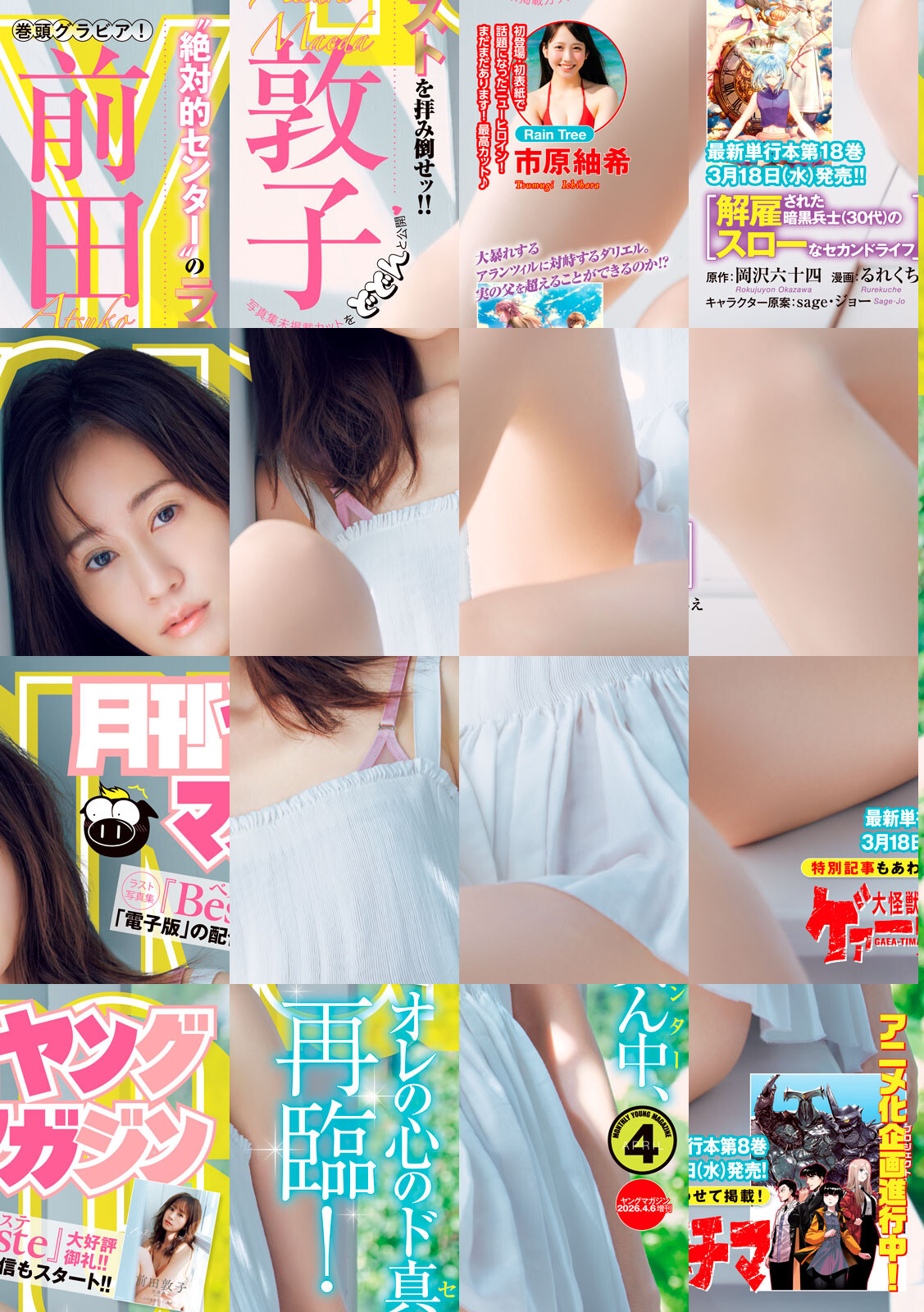 オモロいもカワイイも....。月刊ヤンマガは欲張りに常にベストを更震中!! 巻頭グラビアは前田敦子ちゃん! 一時代を築いた“絶対的センター”が満を持して月刊ヤンマガに登場!!14年ぶり発売の“ラスト写真集”『Beste』絶好調発売中! 巻末グラビアは市原紬希まだまだある!極かわカット満載でお届け! 漫画は大怪獣ゲァーチマ!アニメ化企画(企画のルビ:プロジェクト)進行中!最新刊第8巻、3月18日(水)発売!特別記事もあわせて掲載!