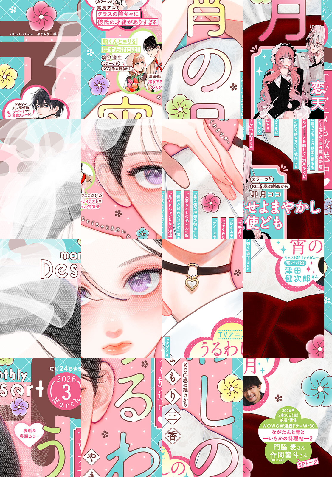 表紙&巻頭カラーは、10巻が大ヒット&アニメも絶賛放映中の『うるわしの宵の月』! 10巻の続きから読めちゃいます! さらに、『恋せよまやかし天使ども』では発売中の6巻と連動でのフォトフレーム風ステッカーがもらえる応募者全員プレゼントが実施☆彡 大人気『頼くんとヨリを戻すわけには!』はカラー付きで連載再開&裏表紙に登場! マンガアプリPalcyで大人気の『クラスの陰キャに彼氏の才能がありすぎる』がデザートでも連載スタート★ TVアニメ『うるわしの宵の月』からは、“宵パパ”を演じる津田健次郎さん撮り下ろしインタビューも! 『ゆびさきと恋々』『ひかえめに言っても、これは愛』『花野井くんと恋の病 番外編』が読めるのも、デザートだけ★ 2026年もデザートをよろしくお願いします(*^^*)! ※電子版では、紙の雑誌と内容が一部異なる場合や、掲載されないページがあります。ご了承ください。 ※『恋せよまやかし天使ども』応募者全員プレゼント応募券は、電子版には付属いたしません。 ※内容の一部は、2026年4月23日までの閲覧期限となります。