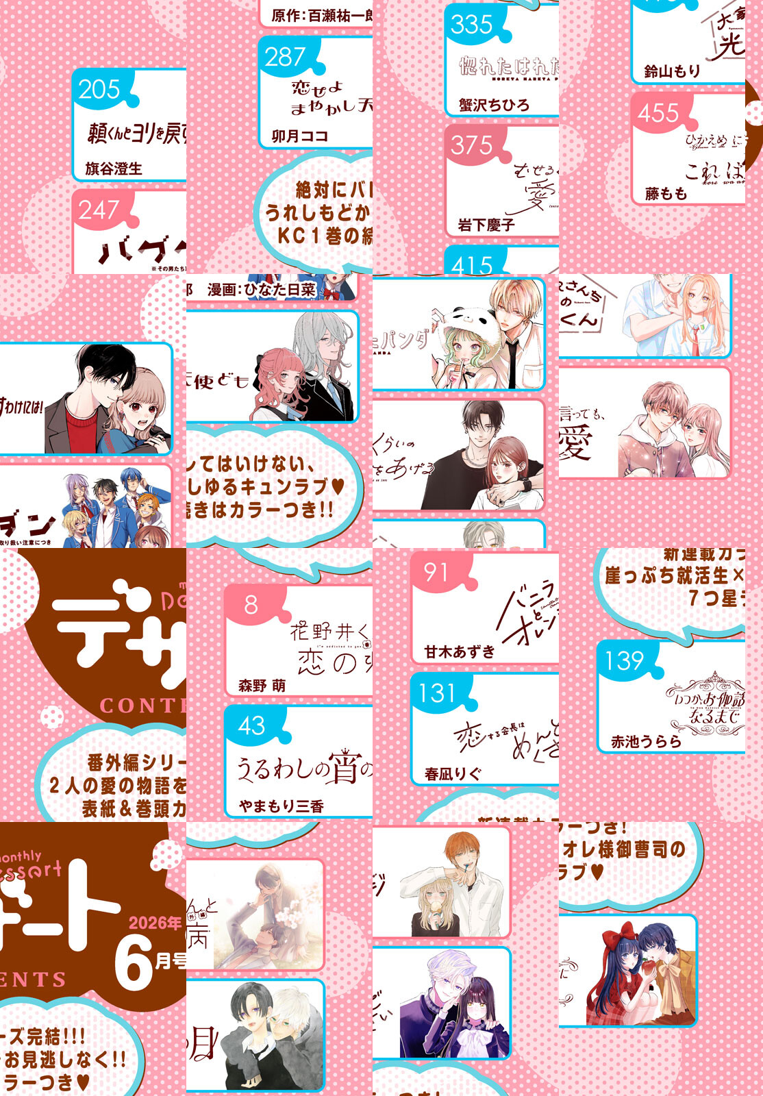 連載開始から8年4か月! 表紙&巻頭カラーは、『花野井くんと恋の病』が登場! ついに番外編シリーズが完結です!! さらに1巻が話題沸騰中の『惚れたはれたパンダ』がカラー付きで連載再開☆彡 赤池うららさんの新連載『いつか、お伽話になるまで』がカラーつきでスタート★ 崖っぷち就活生×オレ様御曹司の7つ星ラブが開幕! 『バニラとオレンジ』など新連載ヒーローたちのプロフ企画も♪ 『うるわしの宵の月』『恋せよまやかし天使ども』『沼すぎてもはや恋』が読めるのも、デザートだけ★ 忘れられない恋が満開! デザート6月号をよろしくお願いします(*^^*)! ※電子版では、紙の雑誌と内容が一部異なる場合や、掲載されないページがあります。ご了承ください。