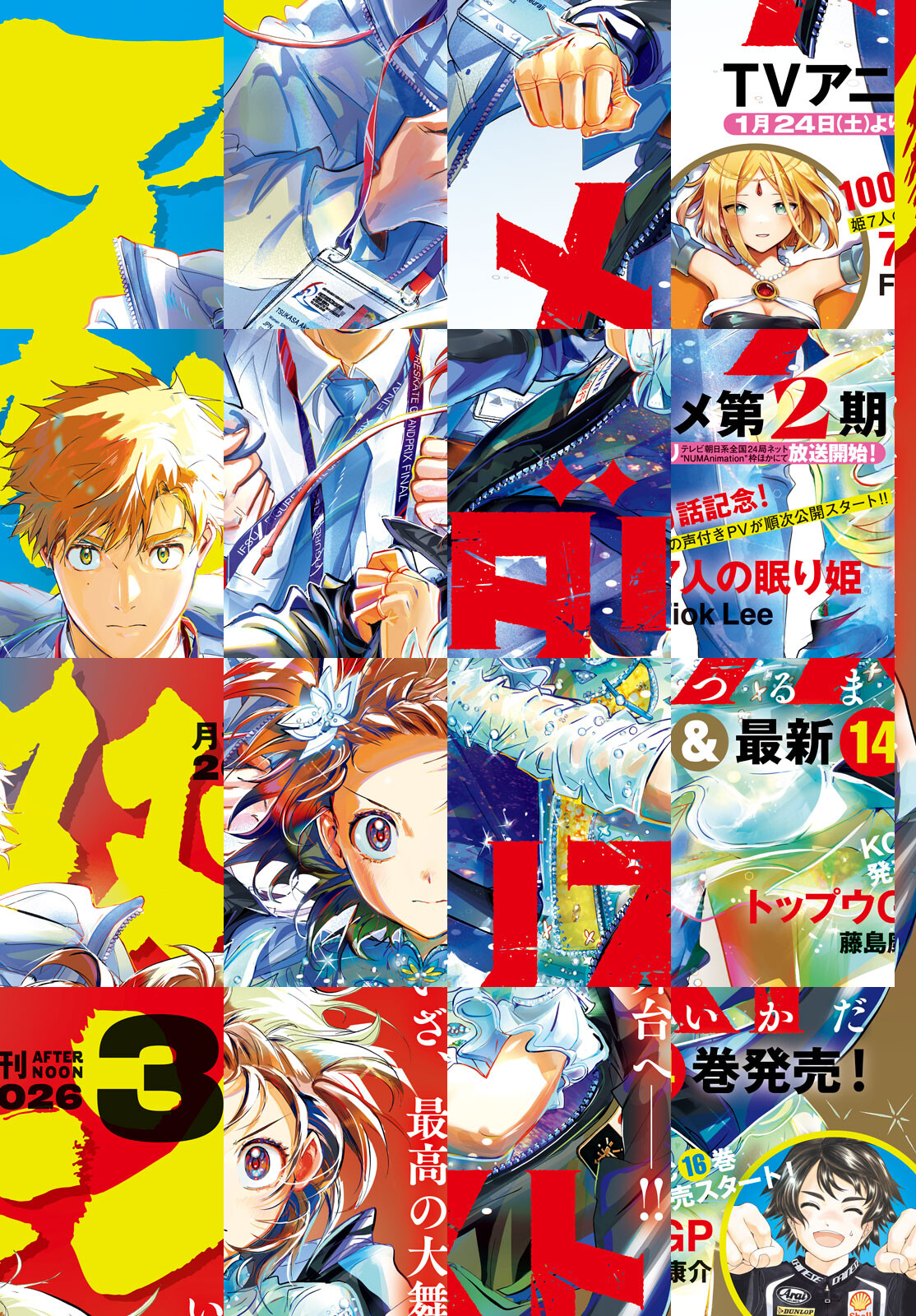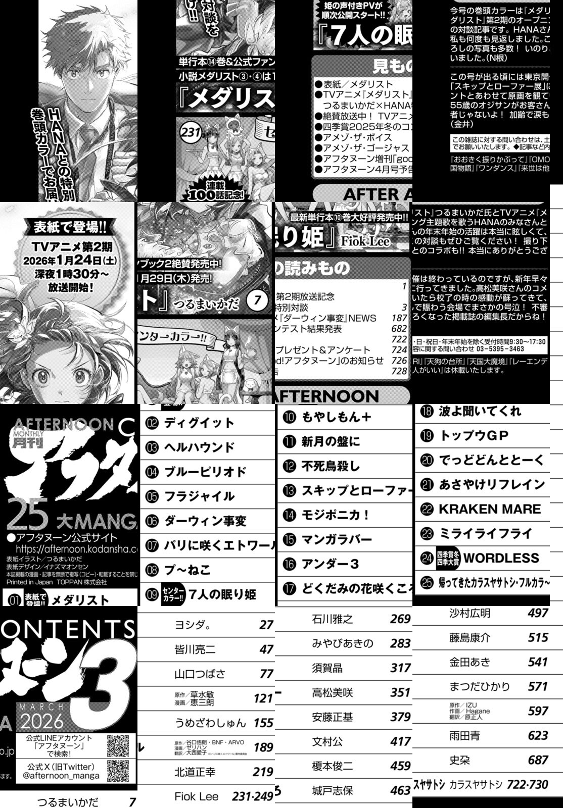 アフタヌーン3月号、表紙は1月24日(土)よりテレビ朝日系全国24局ネット"NUMAnimation"枠ほかにてTVアニメ第2期放送開始の『メダリスト』(つるまいかだ)!巻頭カラーはTVアニメ『メダリスト』第2期OP主題歌アーティストHANA×つるまいかだスペシャル対談!超熱い語らい必見! 巻中カラーは100話記念!『7人の眠り姫』(FiokLee)!姫たちの声付きPV順次公開スタート! TVアニメ大絶賛放送中の『ダーウィン事変』(うめざわしゅん)!新たな敵出現! 今号も熱量メチャ高!