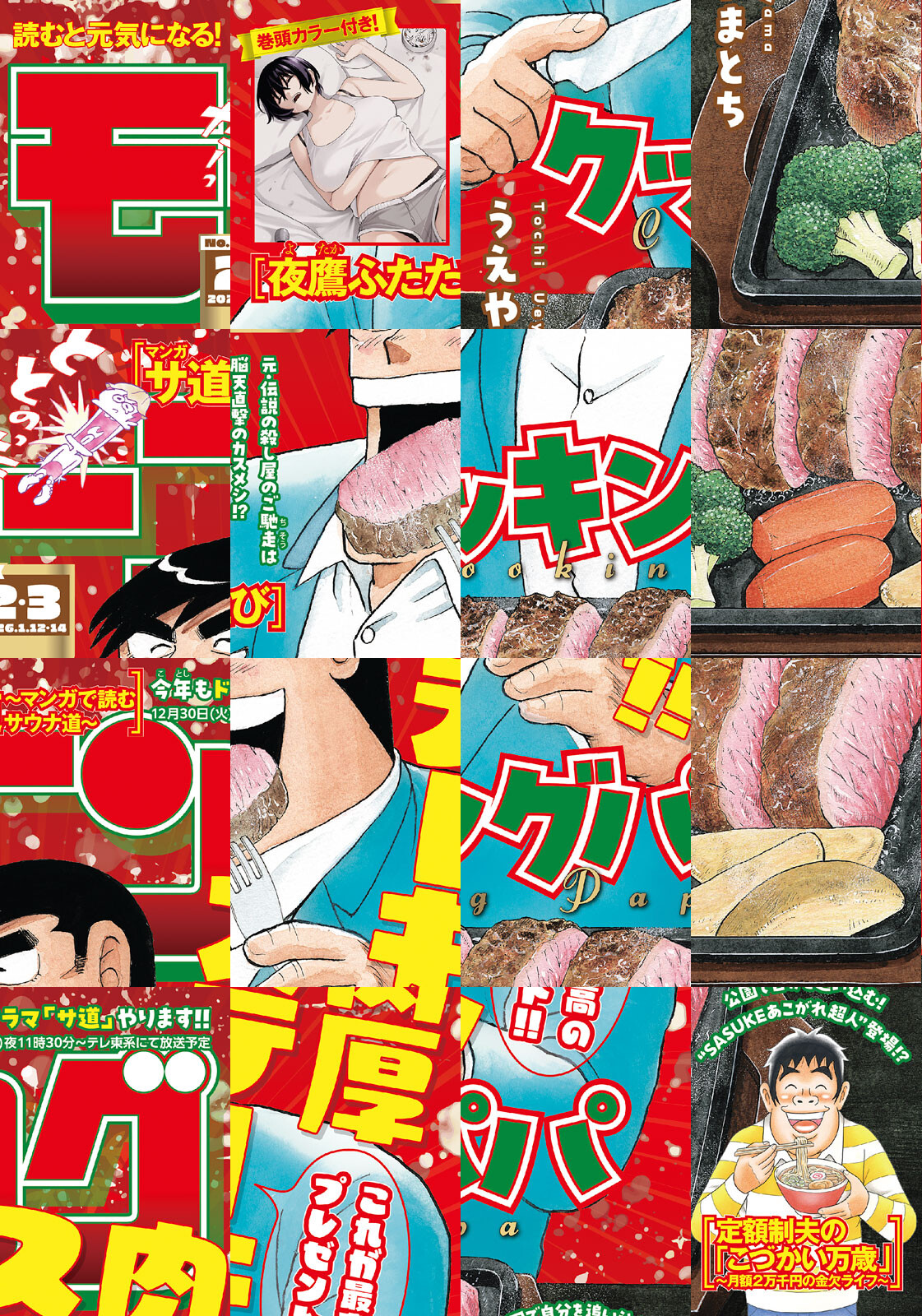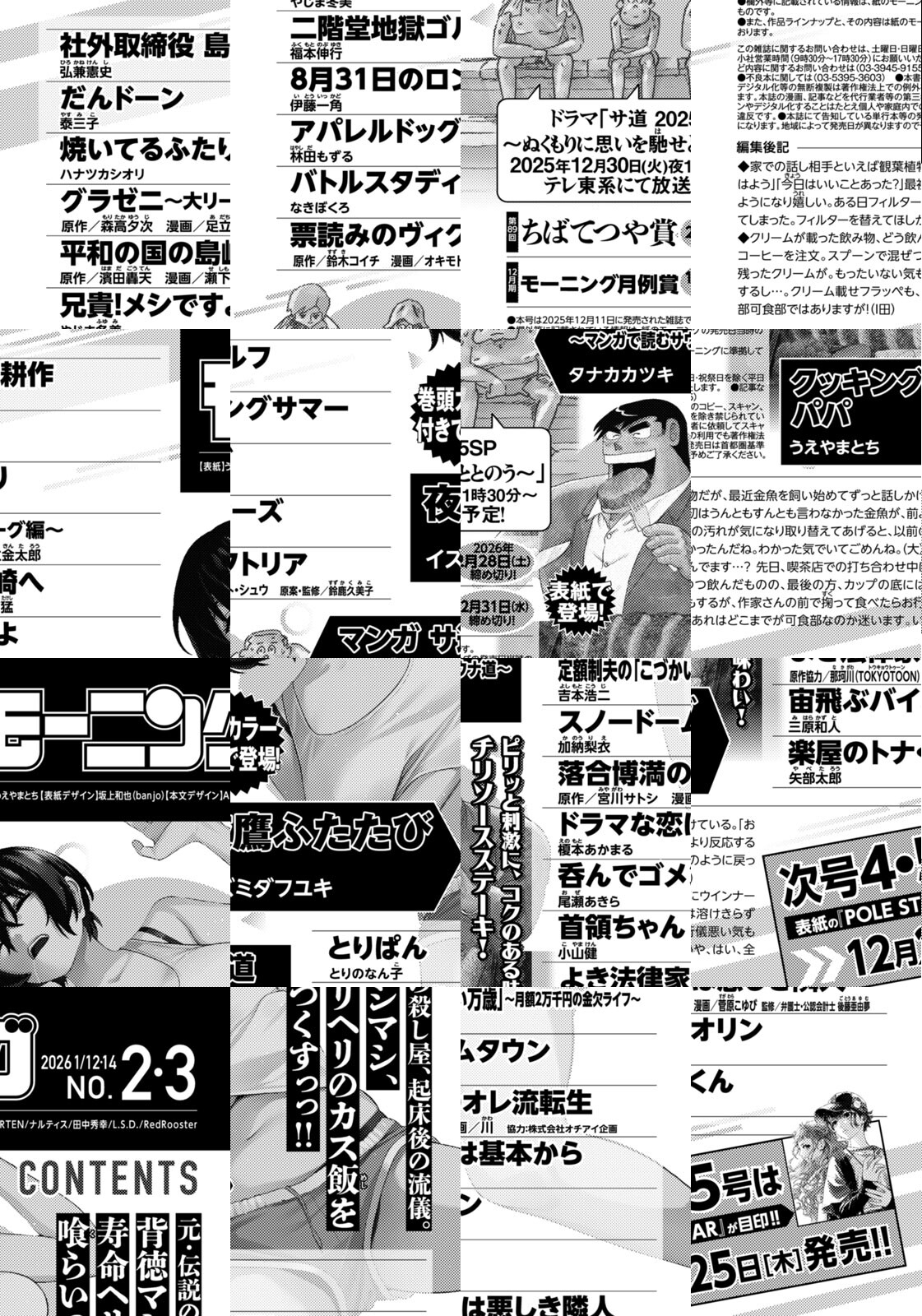 ◎『夜鷹ふたたび』は巻頭カラー付きで登場! 元・伝説の殺し屋、起床後の流儀。背徳マシマシ、寿命ヘリヘリのカス飯を喰らいつくすっっ!! ◎『マンガ サ道~マンガで読むサウナ道~』はドラマ「サ道 2025SP~ぬくもりに思いを馳せととのう~」が2025年12月30日(火)夜11時30分~テレ東系にて放送予定! ◎『クッキングパパ』は表紙で登場! ピリッと刺激に、コクのある味わい! チリソースステーキ! ※作品ラインナップは、紙の「モーニング」に準拠しておりますが、一部、異なる場合があります。