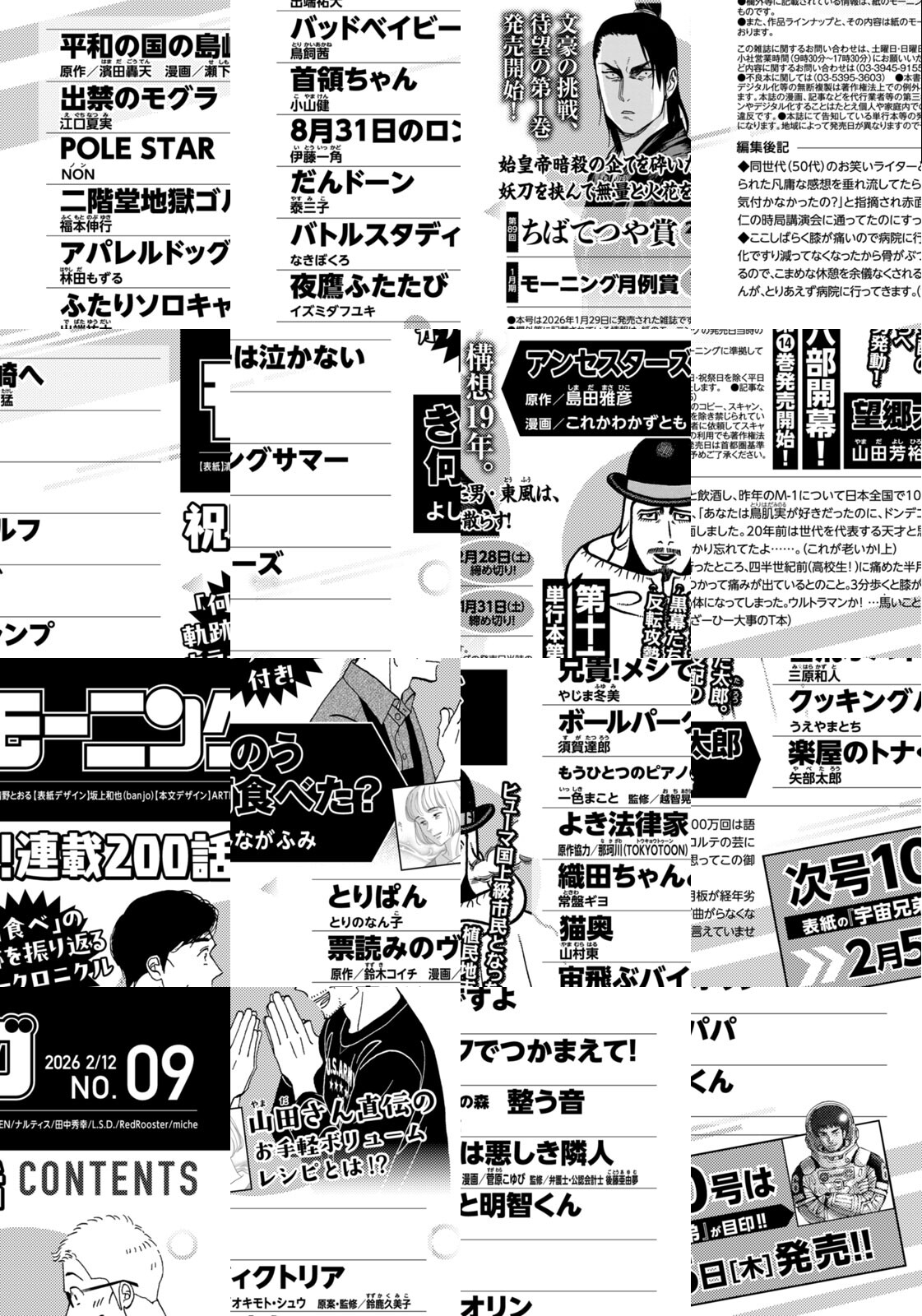 ◎『きのう何食べた?』は表紙で登場! 祝! 連載200話! 「何食べ」の軌跡を振り返るカラークロニクル付き! 山田さん直伝のお手軽ボリュームレシピとは!? ◎『望郷太郎』、第十六部開幕! 単行本第14巻発売開始! ヒューマ国上級市民となった太郎。植民地支配の黒幕たちへ反転攻勢発動!! ◎『アンセスターズ』掲載号! 構想19年。文豪の挑戦、待望の第1巻発売開始! 始皇帝暗殺の企てを砕いた男・東風は、妖刀を挟んで無量と火花を散らす! ※作品ラインナップは、紙の「モーニング」に準拠しておりますが、一部、異なる場合があります。
