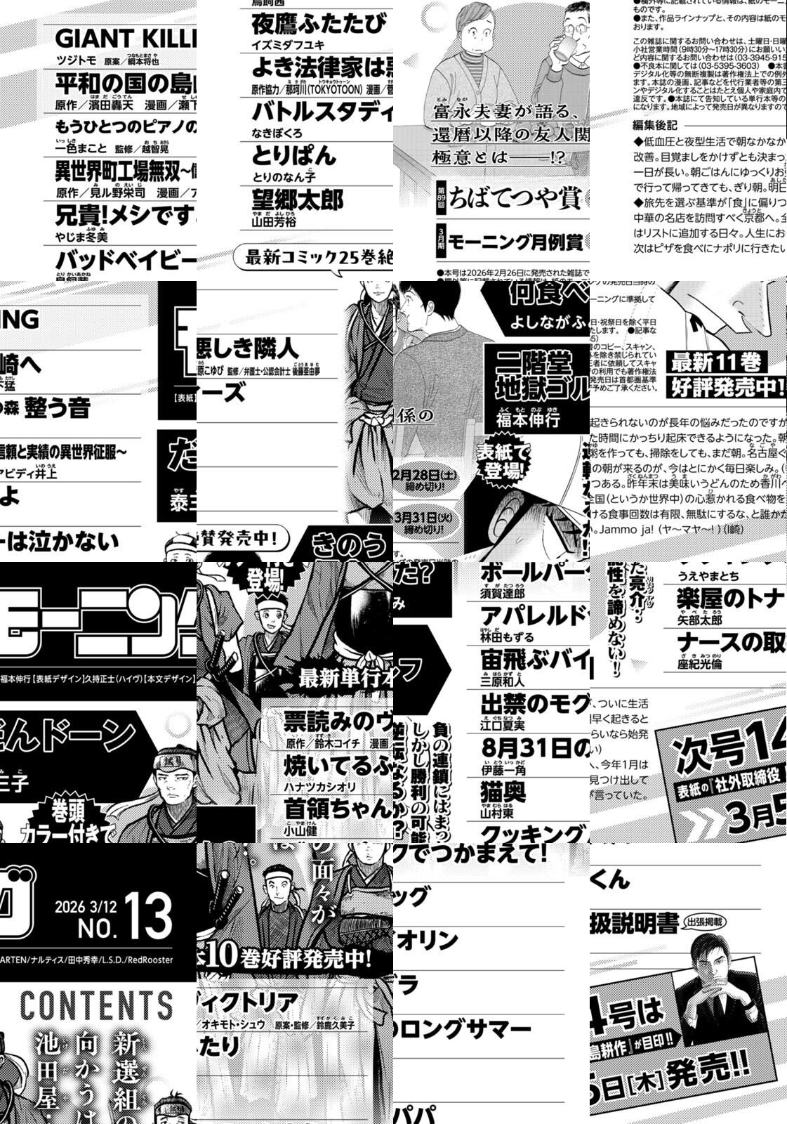 ◎『二階堂地獄ゴルフ』は表紙で登場! 負の連鎖にはまった亮介‥しかし勝利の可能性を諦めない! 逆転なるか!? 最新11巻好評発売中! ◎『だんドーン』は巻頭カラー付きで登場! 新選組の面々が向かうは池田屋…。最新単行本10巻好評発売中! ◎『きのう何食べた?』掲載号! 富永夫妻が語る、還暦以降の友人関係の極意とは――!? ※作品ラインナップは、紙の「モーニング」に準拠しておりますが、一部、異なる場合があります。