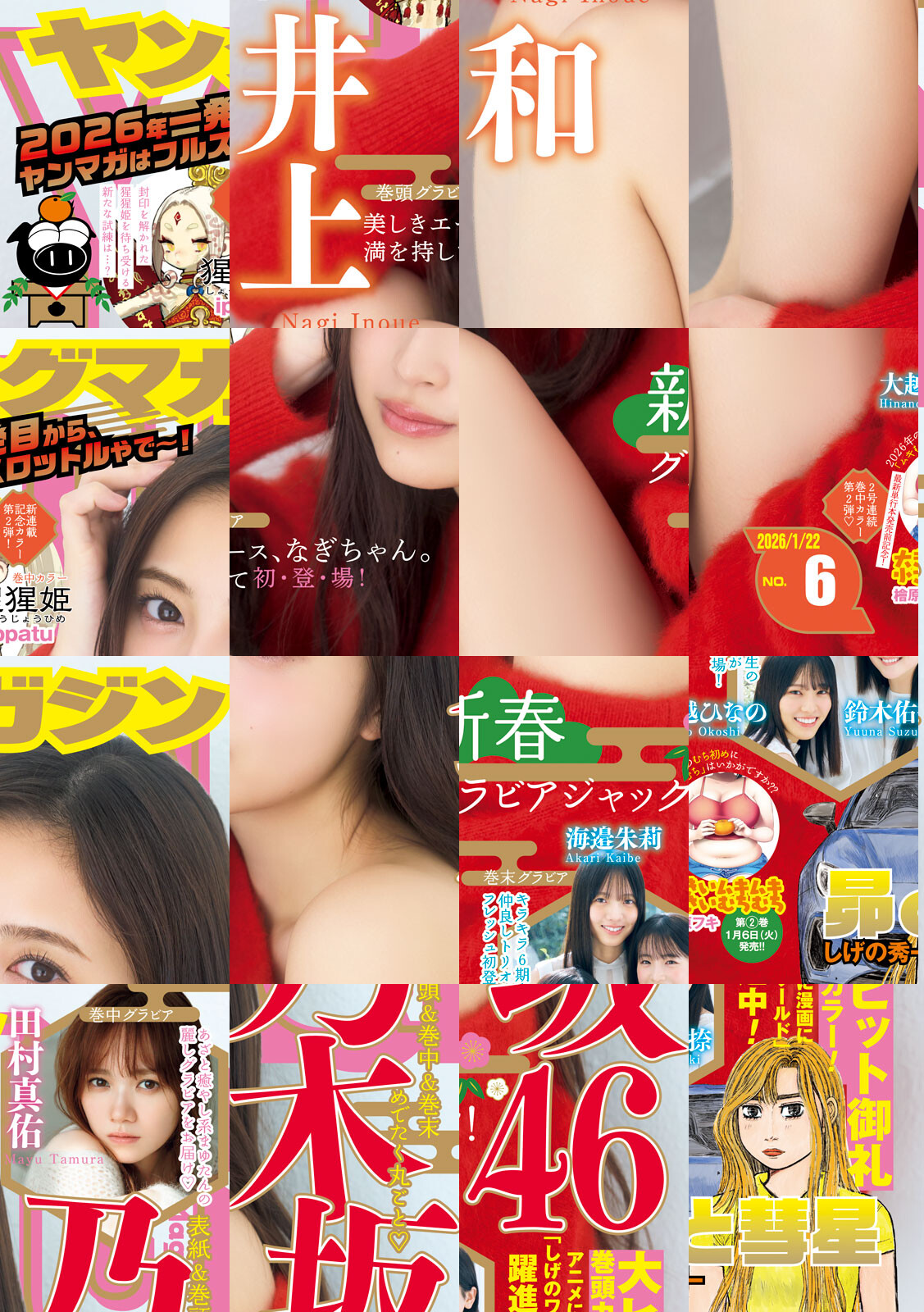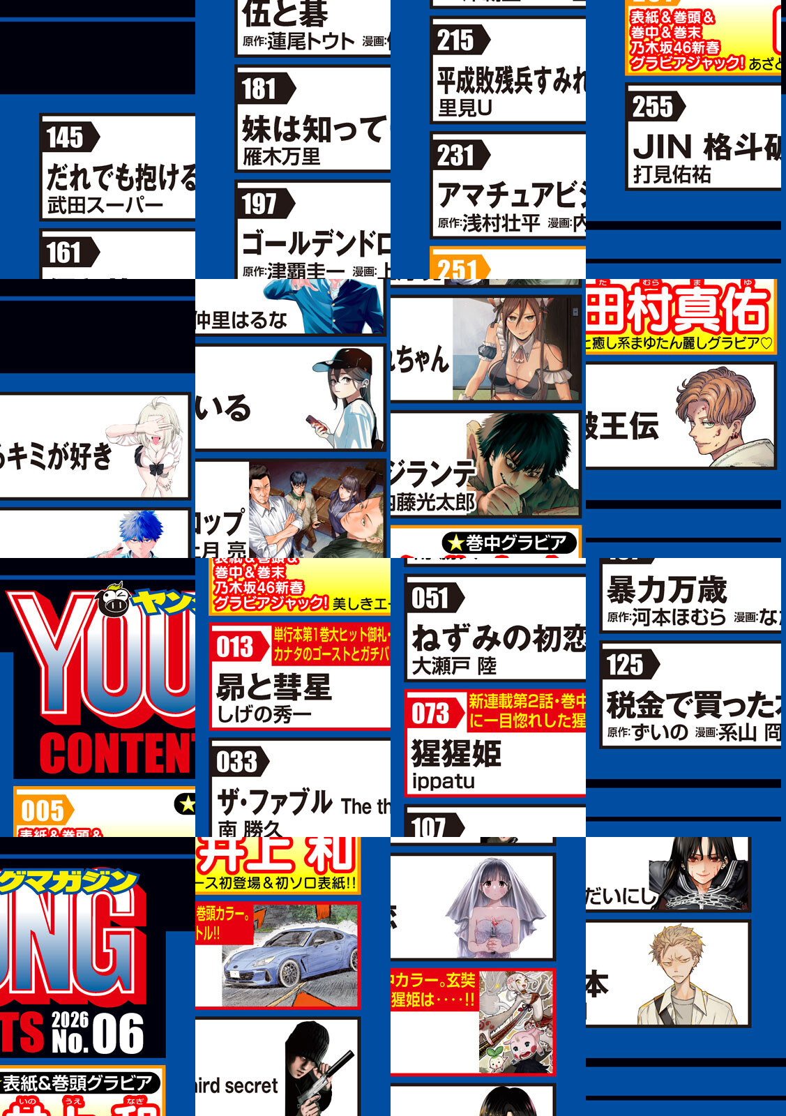 〈巻頭カラー〉『昴と彗星』しげの秀一 単行本第1巻 大ヒット中!工藤彗星、予選で爆走!カナタのゴーストとガチバトル!〈巻中カラー〉『猩猩姫』ippatu 新連載カラー第2弾!玄奘に一目惚れした猩猩姫。バレないように追いかけるも、恋する乙女に試練が立ちはだかる!『大きいムキムキ小さいむちむち』檜原フキ 2026年のむち初めに『ムキむち』はいかがでしょうか!! 華麗に花火が打ち上がろうともムキムキ青年の目には映らず、彼は”ある事”をやっと認める──。〈表紙・巻頭グラビア〉最高の新年がスタート!乃木坂46新春グラビアジャック!! 井上和 美しきエース、ヤンマガ初登場&初ソロ表紙!! 〈巻中グラビア〉田村真佑 あざと癒し系まゆたん麗しグラビア♪ 〈巻末グラビア〉大越ひなの 海邉朱莉 鈴木佑捺 キラキラ6期生の仲良しトリオ初登場★