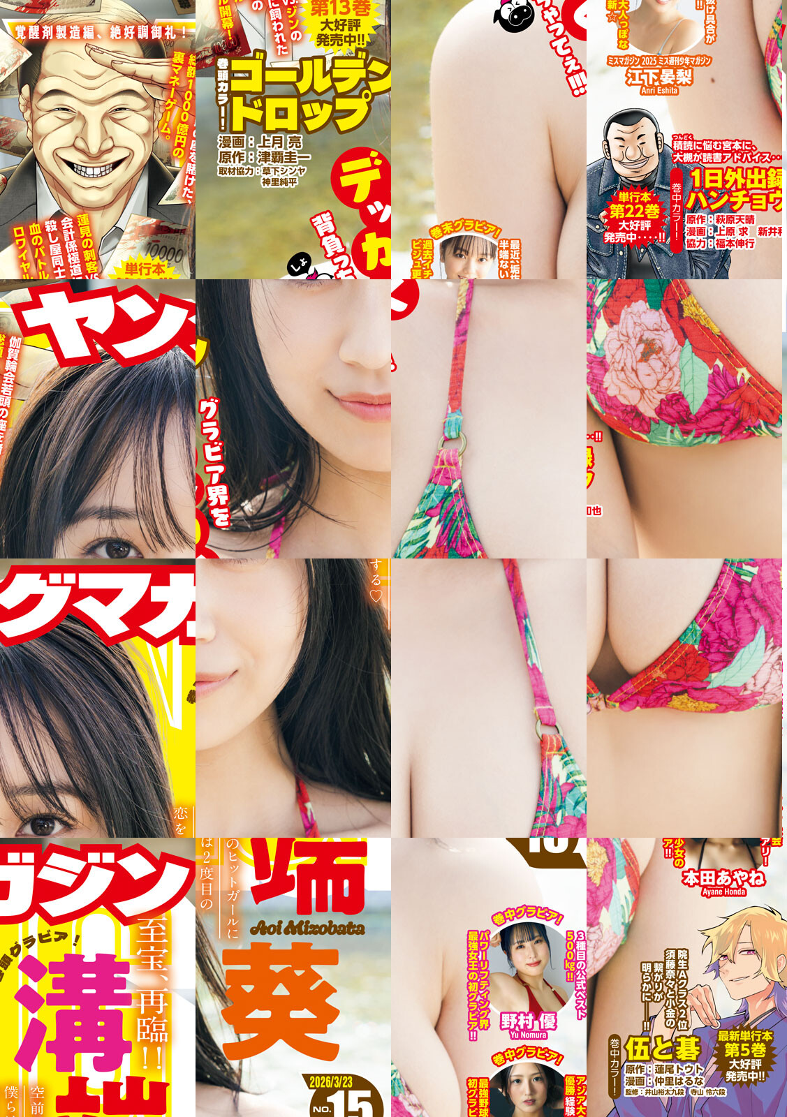 〈巻頭カラー〉『ゴールデンドロップ』漫画:上月亮 原作:津覇圭一 取材協力:草下シンヤ 神里純平 伽賀輪会若頭の座を賭けた、総額1000億円の裏マネーゲーム。蓮見の刺客に対抗すべく、ジンも会計係を投入。極道に飼われた殺し屋同士の、血のバトルロワイヤル開幕! 〈巻中カラー〉『 伍と碁』原作:蓮尾トウト 漫画:仲里はるな 監修:井山裕太九段 寺山怜六段 続々現る院生のトップ達‥‥。Aクラス2位と小金の関係性とは!? 〈巻中カラー〉「1日外出録ハンチョウ」協力:福本伸行 原作:萩原天晴 漫画:上原求 新井和也 宮本の家を訪れた大槻‥‥発見するは大量の難しい本‥‥実は宮本‥‥大量積読中‥‥! 〈巻中カラー〉『昴と彗星』しげの秀一 佐藤昴と工藤彗星のMFG初戦!「芦ノ湖GT」盛り上がってます!〈表紙・巻頭グラビア〉溝端葵 お待たせしました! 爆売れ激マブ女王が最ッ高の仕上がりでカムバック★ 〈巻中グラビア〉パワーリフティング界の女王 野村優 パワー全開!世界チャンピオンが衝撃の初グラビア! 〈巻末グラビア〉金光綾音 U18アジア大会優勝経験アリの超野球少女が健康美MAXのヘルシーグラビア披露!