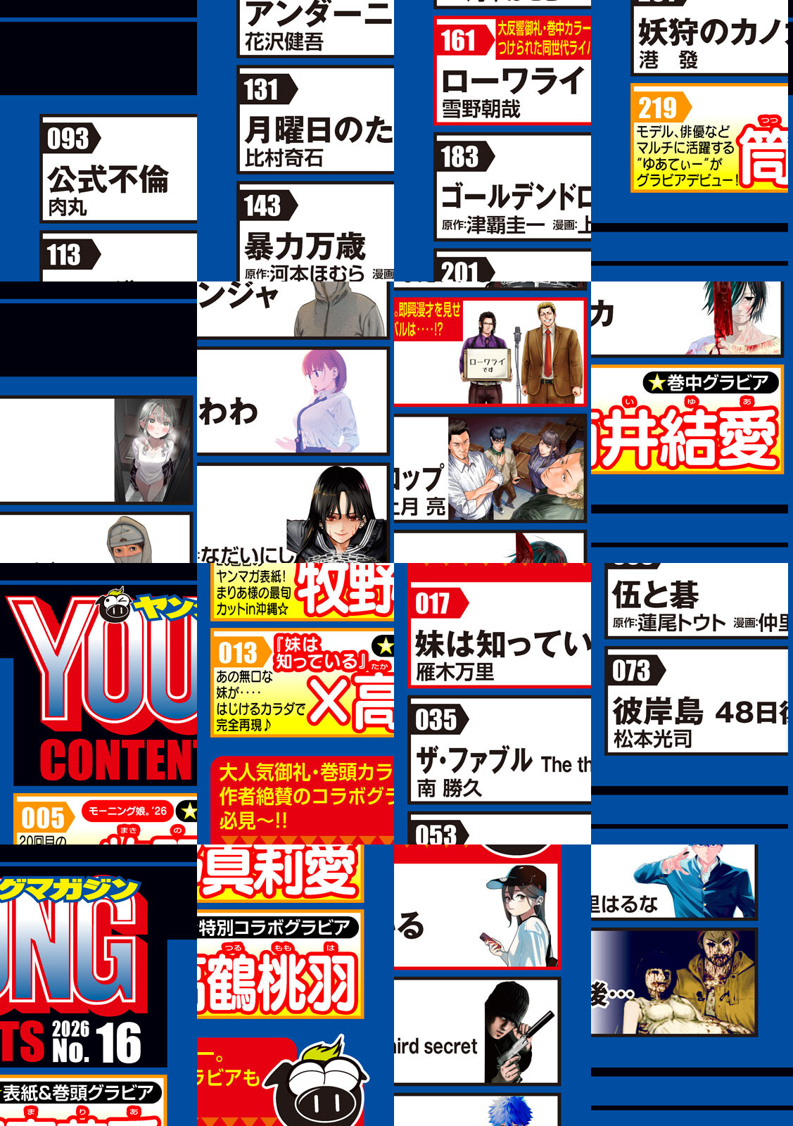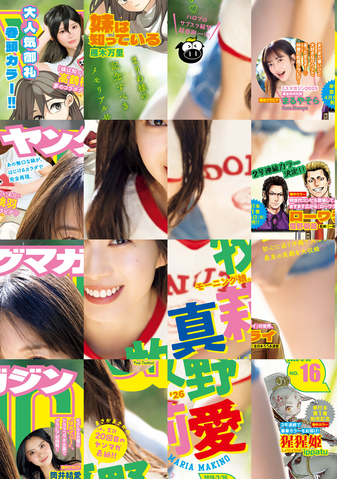 〈巻頭カラー〉妹は知っている 雁木万里 大人気御礼巻頭カラー!!『妹は知っている』×高鶴桃羽 作者絶賛のコラボグラビア開陳! あの無口な妹が、はじけるカラダで完全再現。貴一郎はまだ知らない・・。 石風呂さんと部長が付き合ったってこと。次回、本編はご報告の回です。〈巻中カラー〉ローワライ 雪野朝哉 監修:(一財)全日本ろうあ連盟 大反響御礼!! 怒涛の2号連続カラー!! 勢いに乗る新星『ローワライ』!! 新生コンビ“ローワライ”の即興漫才を見せつけられた同世代コンビ・「キクミル」。打ちひしがれる‥と思いきや?? 単行本第1巻は4/6(月)発売!! 〈巻中カラー〉猩猩姫 ippatu 単行本発売記念!3号連続で豪華カラーをお届け!〈表紙&巻頭グラビア〉牧野真莉愛 20回目の表紙!初心に帰り沖縄でシュート!やっぱり好きです!! まりあ様♪ 〈巻中グラビア〉筒井結愛 モデル、俳優業、インフルエンサーなどマルチな才能をみせる“ゆあてぃー”、ドラマコラボ企画でグラビアデビュー!! 〈巻末グラビア〉まるやそら ミスマガジン2025 審査員特別賞 巻中グラビア まだまだ寒いけど大好きなサウナであったまるぞー♪ 仲春の和風グラビア!