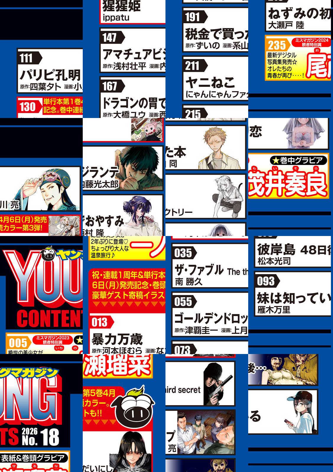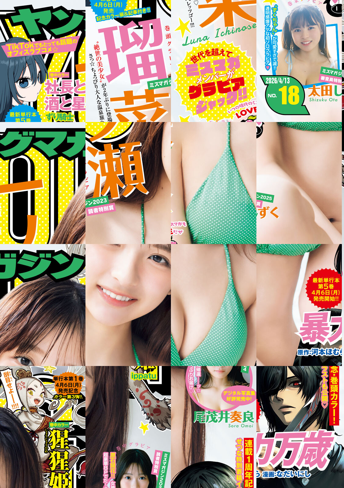〈巻頭カラー〉『暴力万歳』原作:河本ほむら 漫画:なだいにし 祝!連載1周年記念&単行本第5巻発売直前 巻頭カラー!! 勢いは増すばかりッ!重版続々で感謝感激万歳ッ!豪華ゲスト寄稿イラストもお楽しみに★ 〈巻中カラー〉『猩猩姫』ippatu 単行本発売記念カラー第3弾! 今回はなんと…超豪華プレゼントキャンペーン! 〈巻中カラー〉『社長と酒と星』ずり騎士 TikTokでもとっても話題のオフィスラブコメ☆ 最新刊第5巻4月6日発売記念のカラー扉&記事付き!!〈表紙・巻頭グラビア〉ミスマガジン2023読者特別賞 一ノ瀬瑠菜 “絶世の美少女”が2年ぶりに登場☆ さっ!ちょっぴり大人な温泉旅へレッツゴー!!! 〈巻中グラビア〉ミスマガジン2024 読者特別賞 尾茂井奏良 オレたちの青春が再び・・! そらちゃん電撃カムバックやで♪ 〈巻末グラビア〉ミスマガジン2025 審査員特別賞 太田しずく “ずくちゃん”が可愛すぎで滅!! 透明感爆アゲな初ソログラビア!