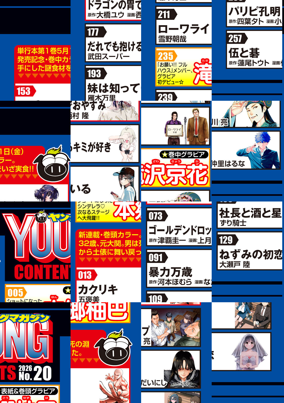 〈巻頭カラー〉『カクリキ』五褒美巻頭カラー!!新連載!!32歳、元大関。男は死の淵から土俵に舞い戻ってきた。その魂を燃やし尽くすためにーー。〈巻中カラー〉『ドラゴンの胃でおやすみ』原作 大橋ユウ作画 西村隆 大人気御礼巻中カラー!手にした謎食材をいざ実食‥!!『ヤニねこ』にゃんにゃんファクトリーTVアニメ『ヤニねこ』新情報解禁 巻中カラー!!!すっげークオリティのすっげーアニメ、楽しみにしとけにゃ。〈表紙・巻頭グラビア〉「本郷柚巴」頂点だけは、ゆずらへん☆ショートになったグラビアシンデレラ、次のステージへ!〈巻中グラビア〉「滝沢京花」アイドルグループ「お願い!! フルハウス」メンバー衣装を脱ぎ捨てグラビアデビュー!!〈巻末グラビア〉「夏芽すず」「池田レイラ」2人と過ごす、とびきり甘い365日♪