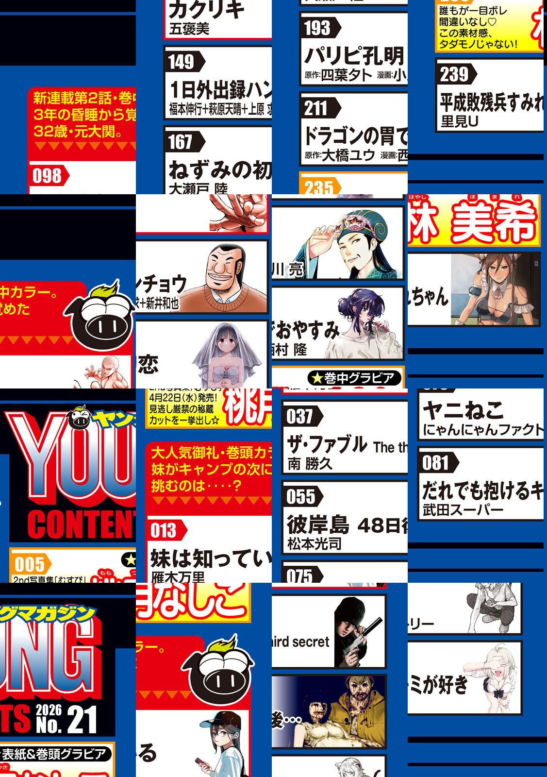 〈巻頭カラー〉『妹は知っている』雁木万里 大人気御礼巻頭カラー4p!”○○系アイドル”への道は前途多難。妹がキャンプの次に挑むのは‥‥?次号、何かがひらめいて煌めきます。〈巻中カラー〉『カクリキ』五褒美 新連載第2話!!3年の昏睡から目覚めた32歳・元大関。一度破れた夢を求めて、もう一度土俵へーー。〈表紙・巻頭グラビア〉桃月なしこ 2nd写真集『むすび』が、いよいよ4/22(水)発売!! 見逃し厳禁の秘蔵カットを一挙出し!〈巻中グラビア〉林 美希 誰もが一目ボレの期待の新星☆ この素材勝負の新人、要チェック!! 〈巻末グラビア〉Mayuri 100ページ写真集同時発売決定♪ パワーアップして帰ってきた! 超Mayuriを見逃すな!!