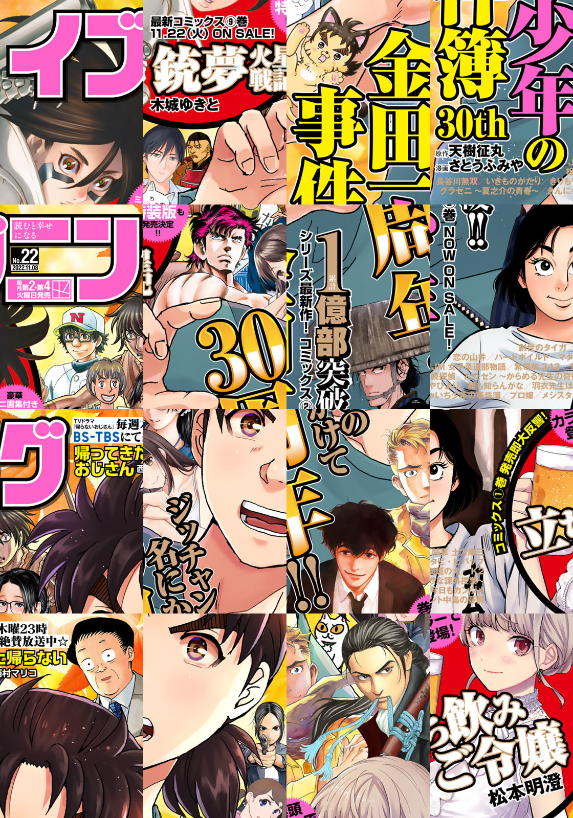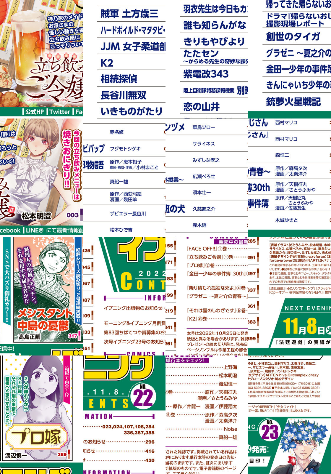 感動・驚き・興奮届けるイブニング22号!! ★★『立ち飲みご令嬢』★★『帰ってきた帰らないおじさん』★★『恋の山井』★★『ハードボイルド・マタタビ・ビバップ』★★『ふたりソロキャンプ』★★『羽衣先生は今日もカンヅメ』★★『賊軍 土方歳三』★★『金田一少年の事件簿30th』★★『いきものがたり』★★『紫電改343』★★『相続探偵』など、話題作続々!