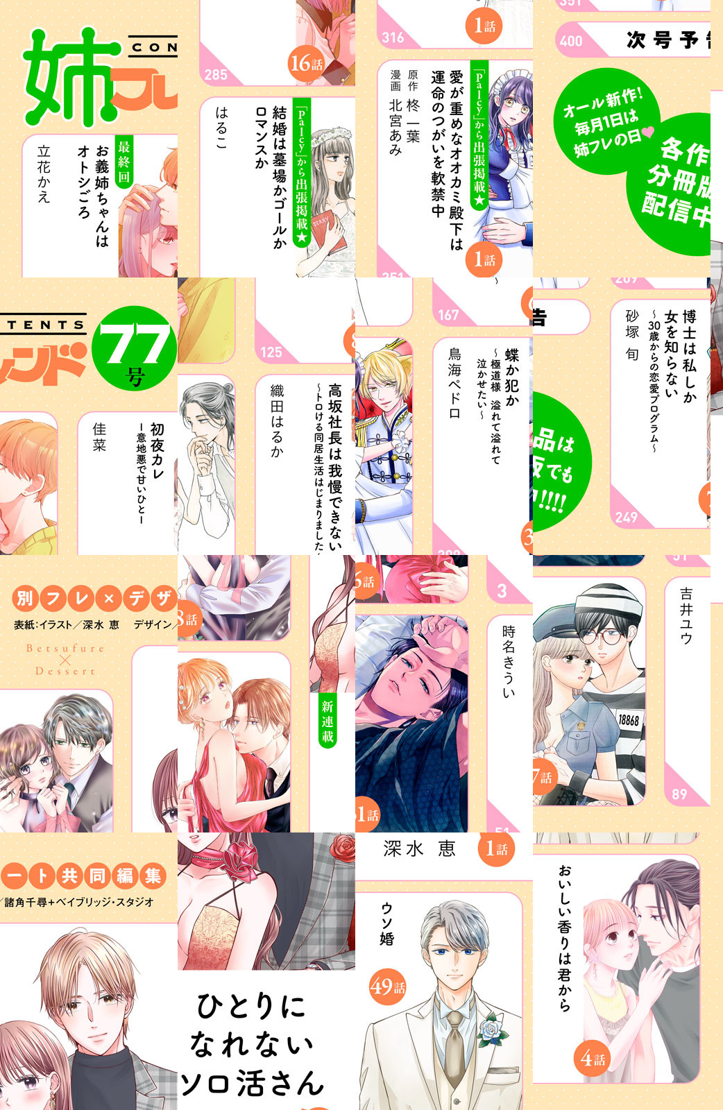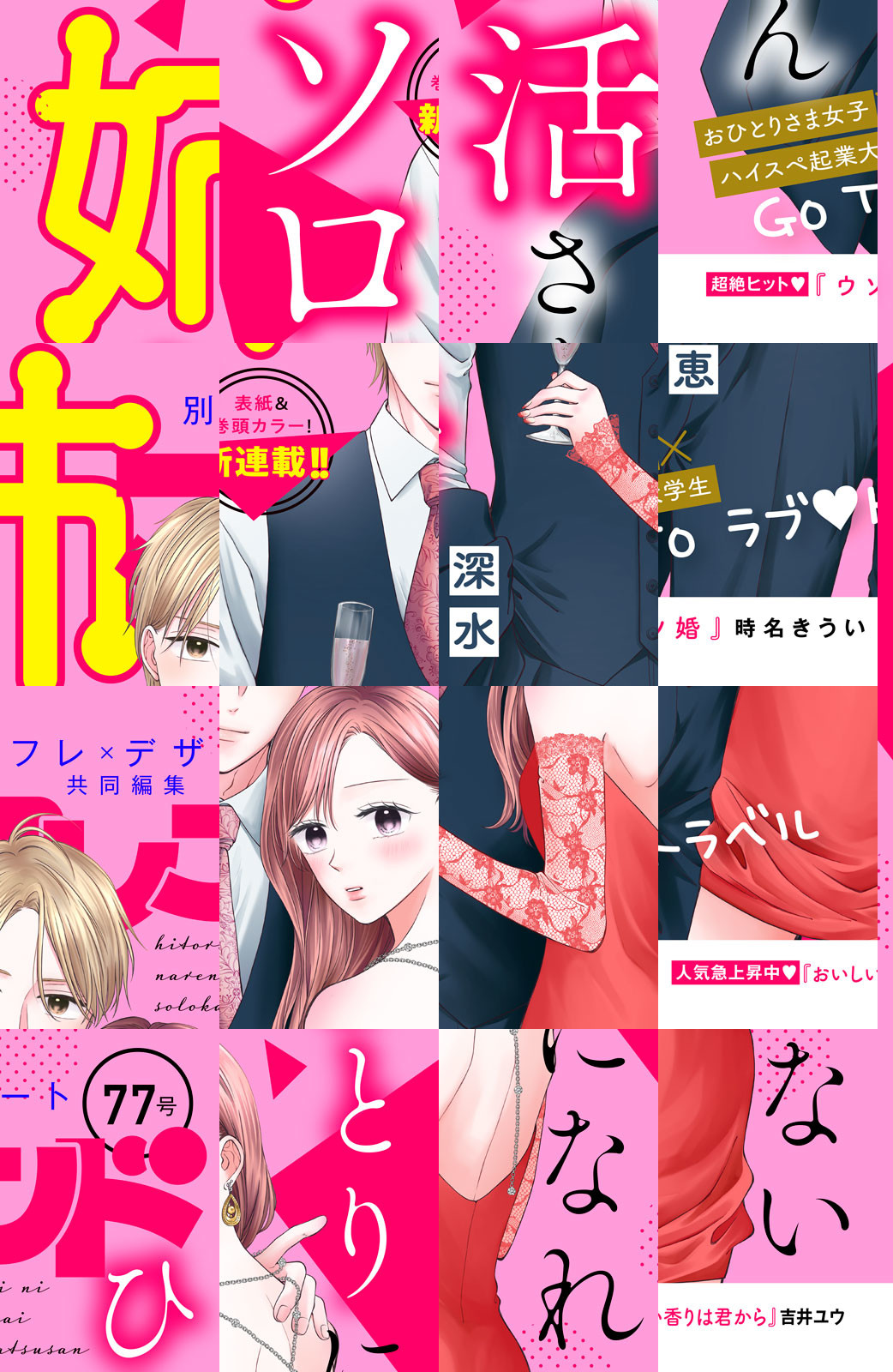 気持ちいい恋、いっぱい! オトナのラブきゅんコミック誌、超豪華ラインナップ!! 表紙&巻頭カラーは、超期待の新連載『ひとりになれないソロ活さん』(深水 恵)がフレッシュに登場!! 失恋をきっかけに、おひとりさまを満喫するはずだったOL芙冬が、ハイスペ起業大学生・直央に甘やかされちゃうーー!? 2人でGo To ラブ・トラベル!! 超絶ヒット連載『ウソ婚』(時名きうい)は、ついに始まる八重&匠の結婚式に超注目!! 人気急上昇中の『おいしい香りは君から』(吉井ユウ)は、亜衣&大越の初キスーー!? 絶対見逃せない展開に!! 大人気連載作品も超充実!! 『初夜カレ ー意地悪で甘いひとー』(佳菜)、『高坂社は我慢できない~トロける同居生活はじまりました~』(織田はるか)、『蝶か犯か ~極道様 溢れて溢れて泣かせたい~』(鳥海ペドロ)、『博士は私しか女を知らない~30歳からの恋愛プログラム~』(砂塚 旬)、『お義姉ちゃんはオトシごろ』(立花かえ)の最新話が掲載!